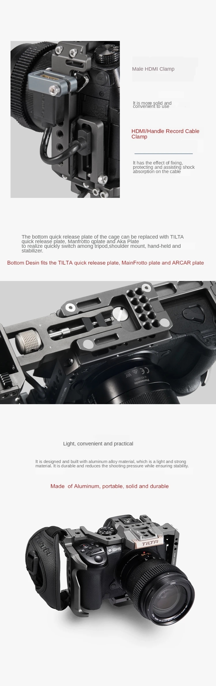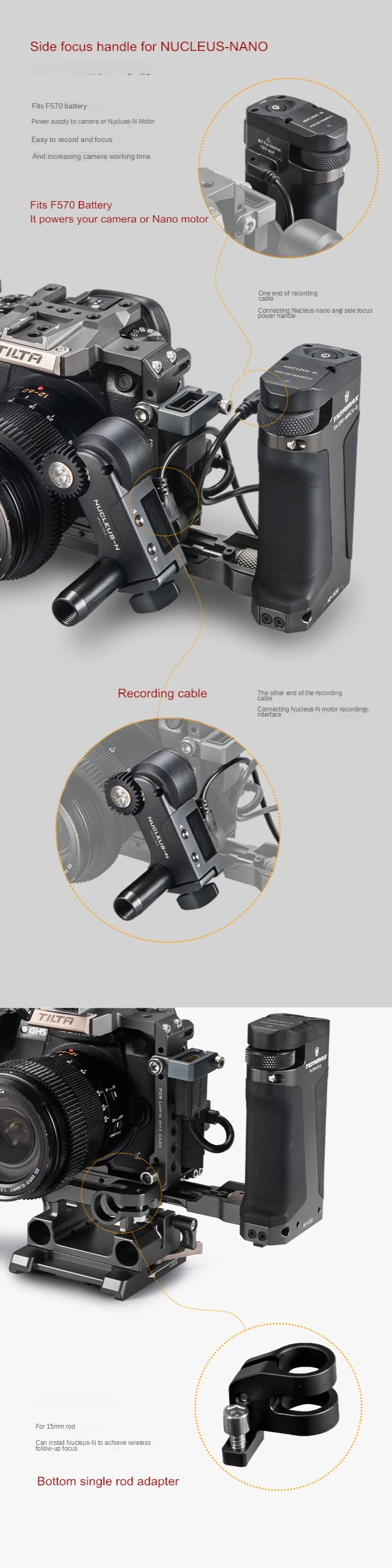 Быстросъемная верхняя ручка и различные дополнительные боковые ручки могут быть прикреплены к клетке, чтобы обеспечить различные способы комфортного управления настройкой камеры.