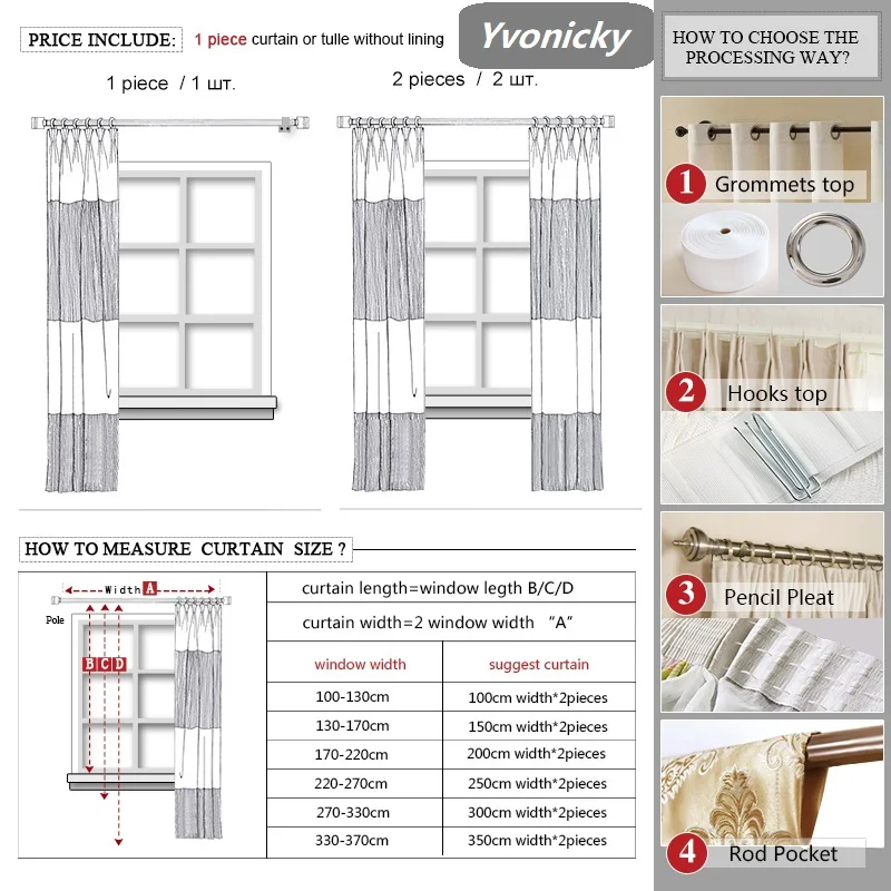 Название товара: прозрачные шторы Материал: Тюль Инструкция по уходу: машинная стирка или ручная стирка оба в порядке. Посылка: 1 шт. или в зависимости от количества заказа. Примечание: рейка поставляется вместе со шторкой. Советы: 1. Цена указана за 1 шт. готовой занавески, пожалуйста, свяжитесь с нами для получения индивидуальных размеров; 2. Ширина шторы должна быть в 2 раза больше ширины карниза/рейки.