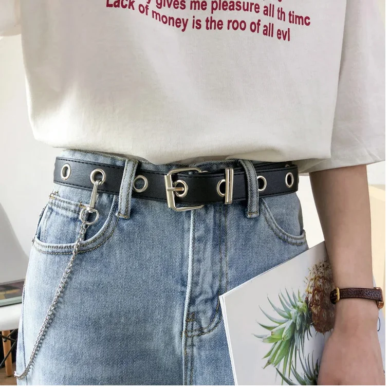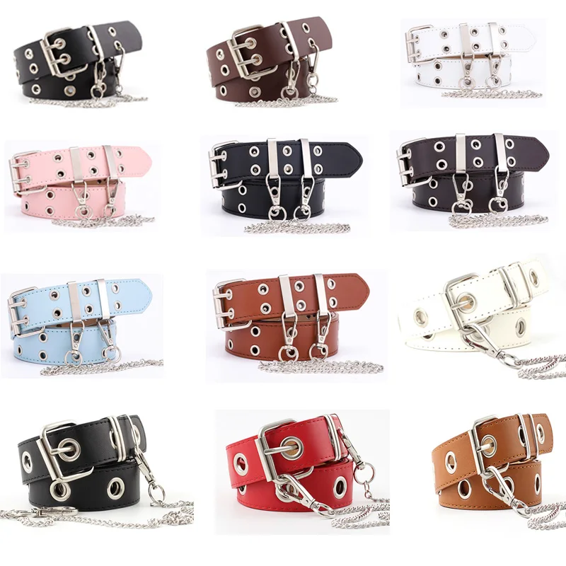 Женский модный ремень с цепочкой в стиле панк Регулируемый разноцветный кожаный ремень с двумяодинарными люверсами и металлической пряжкой