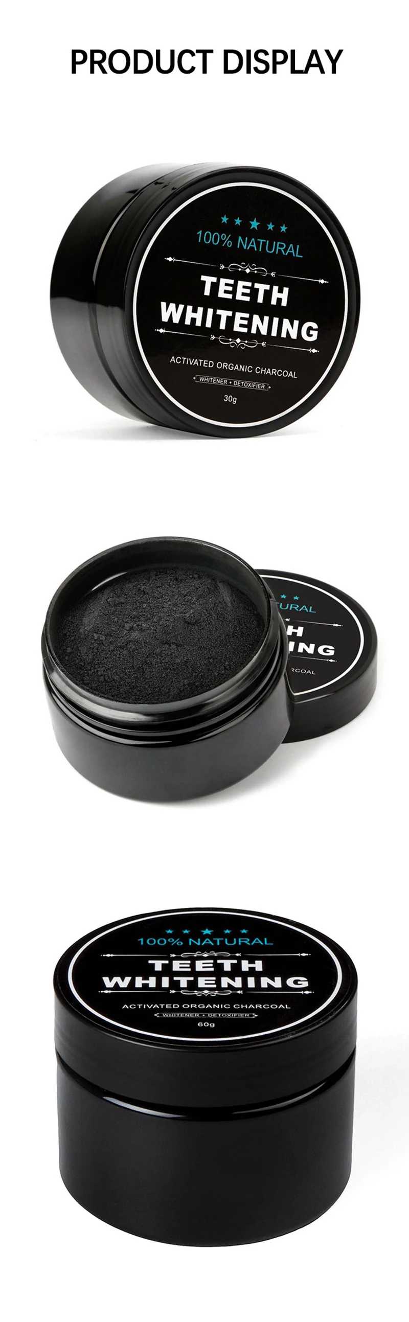 Название продукта: уголь Отбеливание зубов порошок Содержание нетто: 30 г Эффективность: глубоко отбеливает зубы, эффективно удаляет пятна, укрепление зубов и уход за белыми зубами.