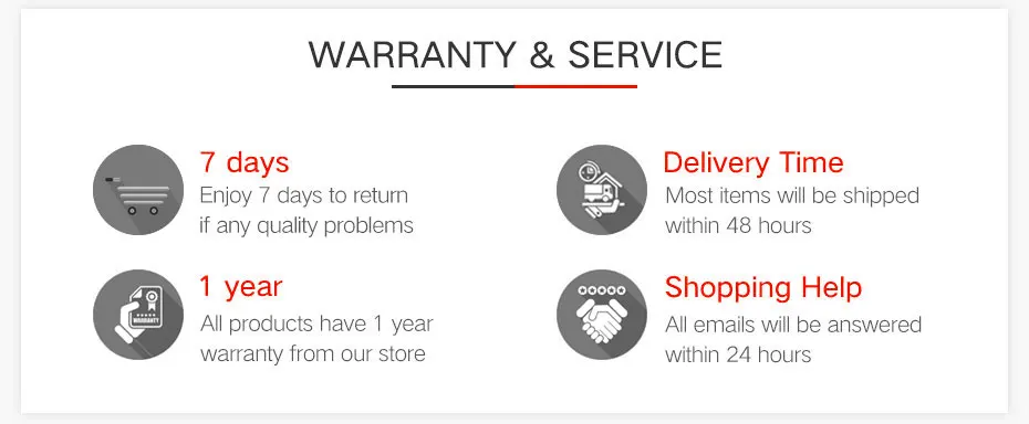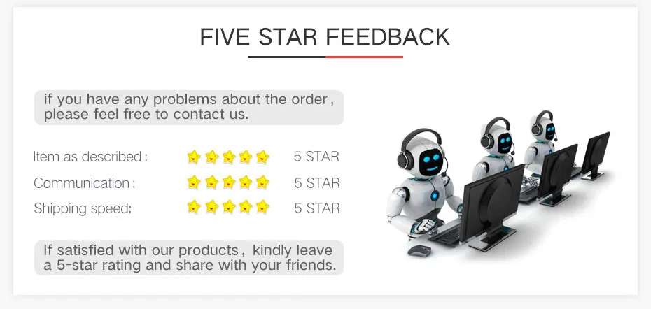 1. Сотрудники отдела продаж очень хорошо осведомлены о продукте, и любые ваши вопросы будут решены здесь.2. После получения товара, пожалуйста, нажмите, чтобы получить товар в AliExpress покупателя. Если вы удовлетворены нашими продуктами и услугами, пожалуйста, оставьте хороший комментарий. Также Добро пожаловать в наш магазин.3. Если товар не получен или товар поврежден, пожалуйста, свяжитесь с нами вовремя. Прежде чем сделать отрицательный отзыв, пожалуйста, свяжитесь с нами, мы готовы решить проблему для вас.Нам нужны положительные отзывы