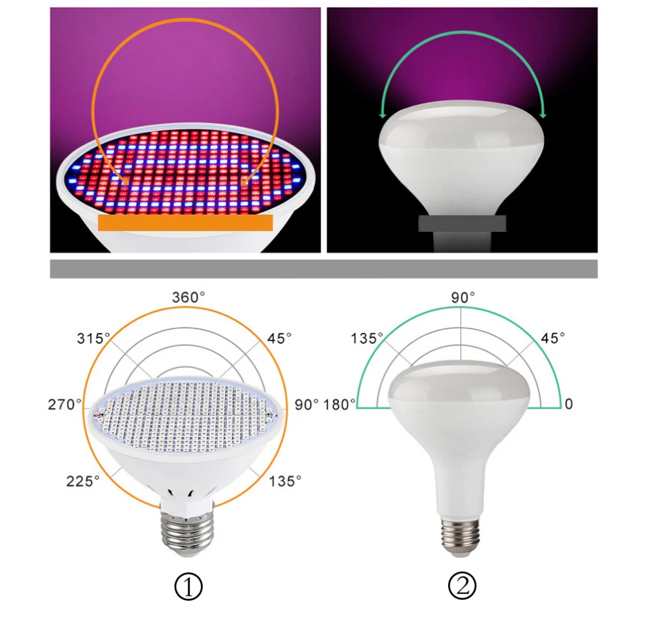 ① Светодиодный светильник для растений (широкий угол облучения, несколько темных зон, широкий диапазон применения) ② Обычный растительный светильник (односторонний светильник, небольшой угол освещения)