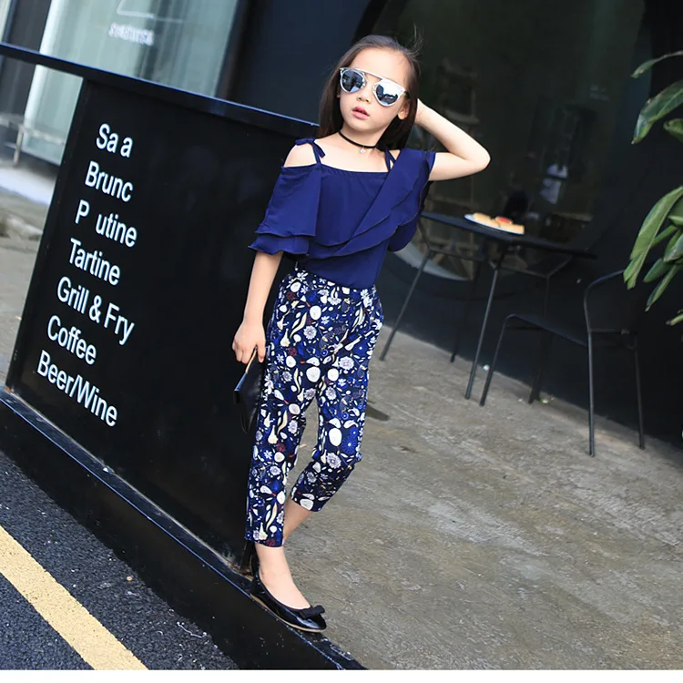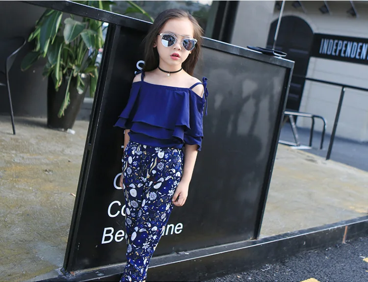 Летняя одежда для подростков, девочек детское летнее платье с открытыми плечами, топы и штаны с цветочным рисунком, детские костюмы комплект одежды для девочек, повседневная одежда для детей без бретелек слинг комплект из двух предметов