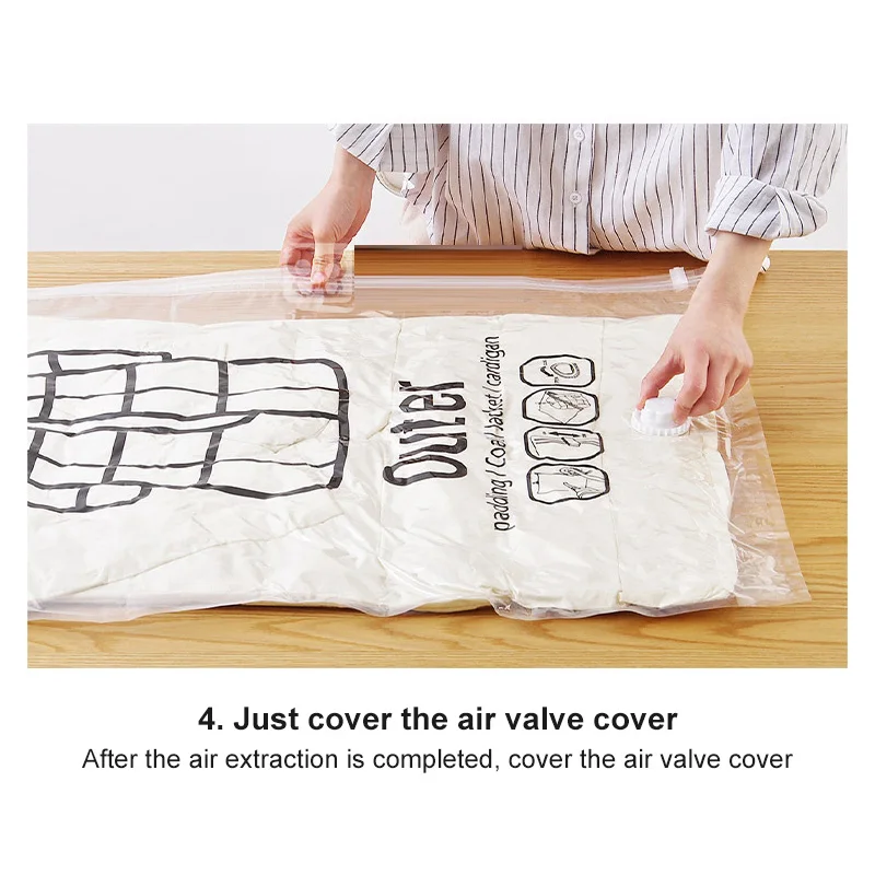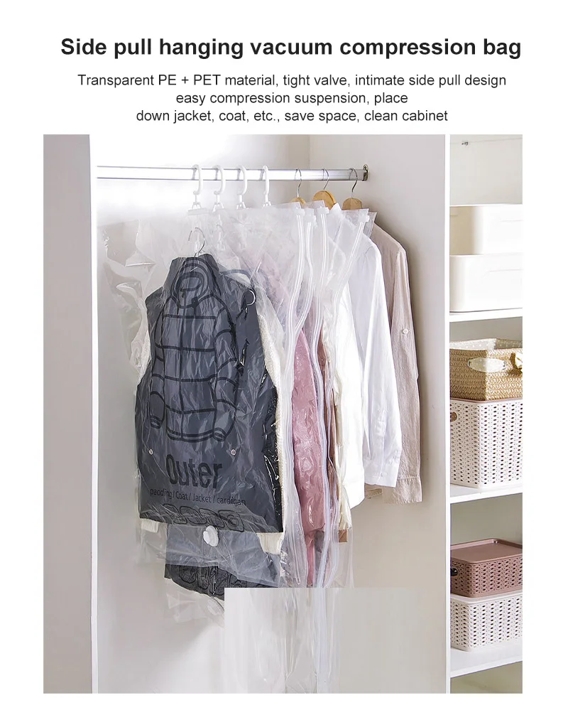 1. Прозрачный ПЭ + ПЭТ материал, компактный клапан, интимная боковая конструкция, легкая компрессионная подвеска, пуховики, пальто и т. Д., экономия места, чистый шкаф.