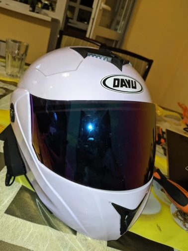 В описании был белый шлем и зелено синее стекло хамелеон. По итогу пришёл розоватовый шлем и сине-фиолетовое стекло(пластик). Качество материала среднее, но и цену нужно учитывать. Брал для поездок на гибридном велосипеде, до 55 км/ч