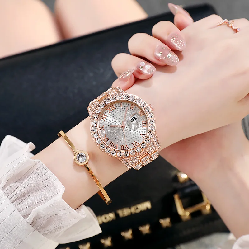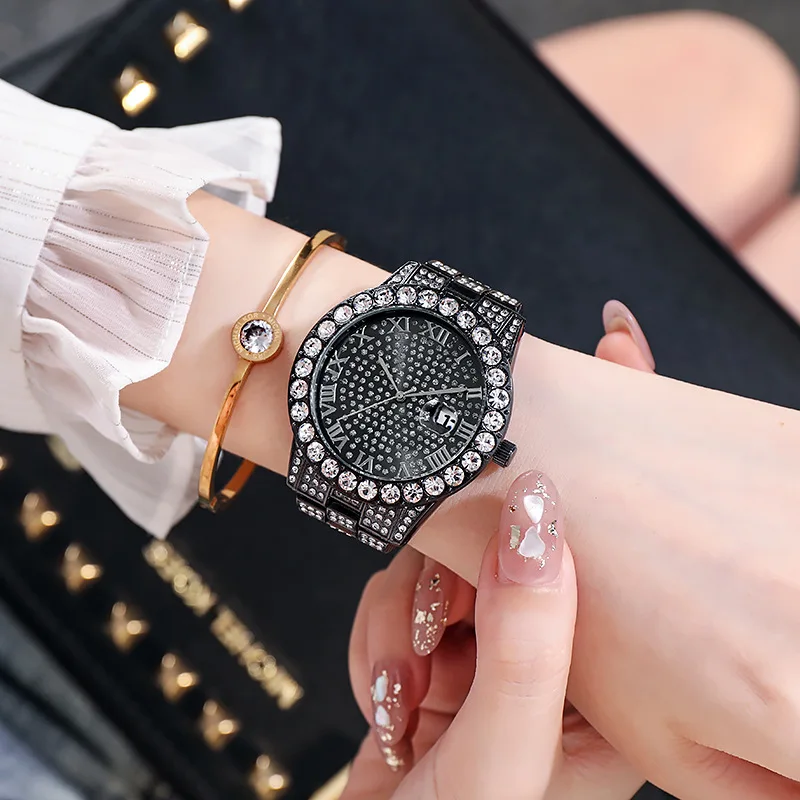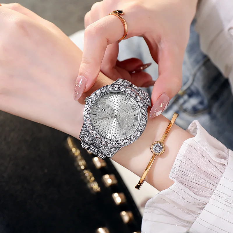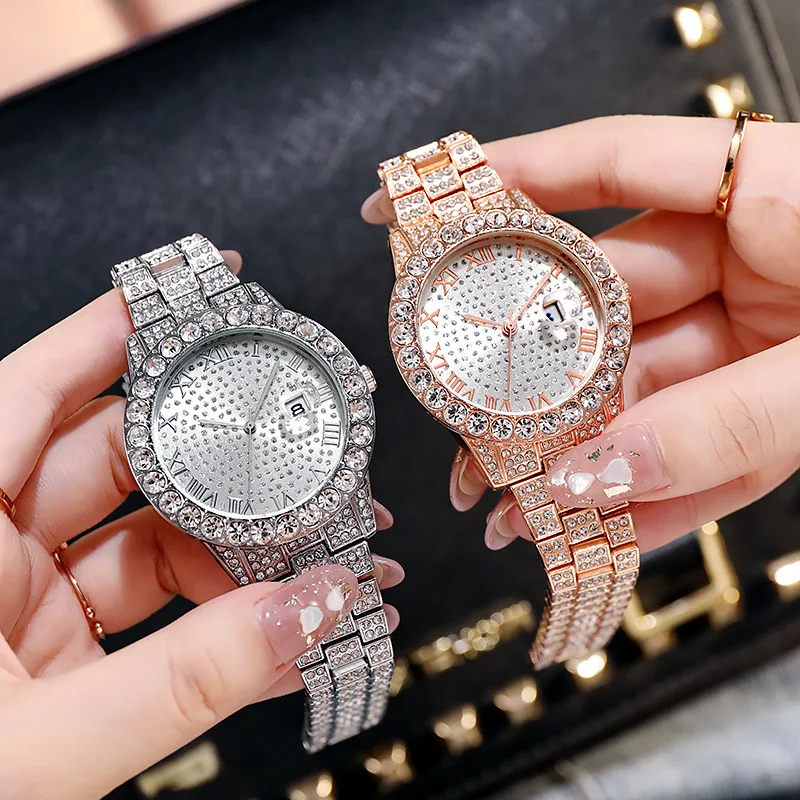 Часы наручные для мужчин и женщин, роскошные брендовые золотистыеСеребристые кварцевые с хронографом, с цветным бриллиантом, в стиле хип-хоп, в стиле рэпера