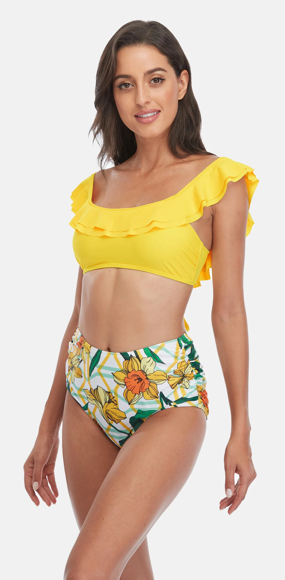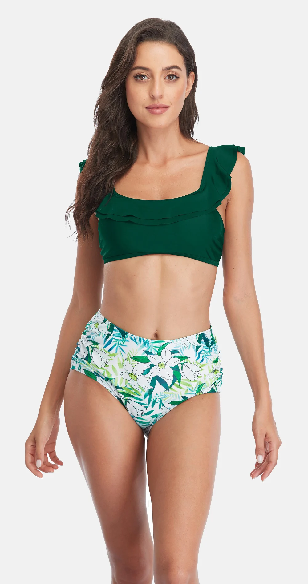 Женский купальник-бикини Anfilia, с цветочным рисунком, с квадратным вырезом, с завязками на спине, с рюшами, с высокой талией, комплект из двух предметов, пляжная одежда