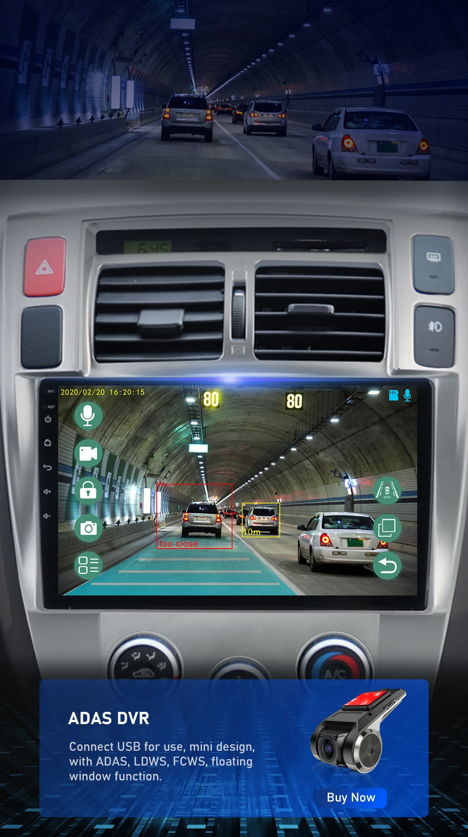 Поддерживает подключение к видеорегистраторУ ADAS. ADAS DVR имеет несколько встроенных ассистивных технологий вождения, вставляя высококачественную карту памяти TF для записи каждого момента вашего вождения.