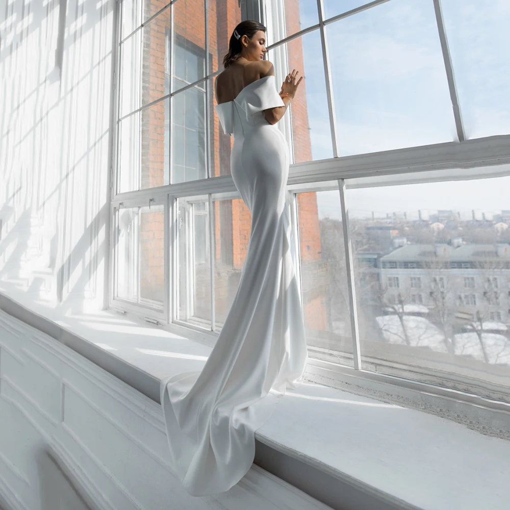 Свадебное платье-Русалка UZN с открытыми плечами, V-образным вырезом и короткими рукавами, атласное свадебное платье, дешевые простые свадебные платья