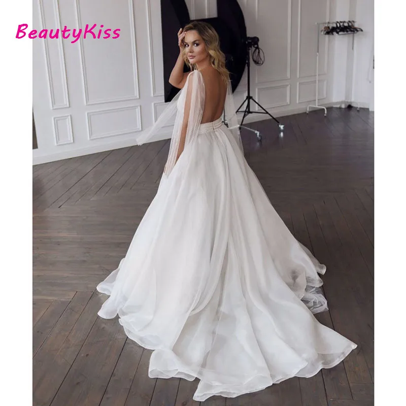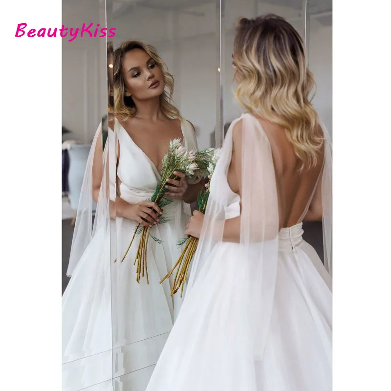 Сексуальные пляжные свадебные платья с открытой спиной 2021, v-образный вырез, складки, трапециевидные женские свадебные платья, размера плюс Vestido De Noiva