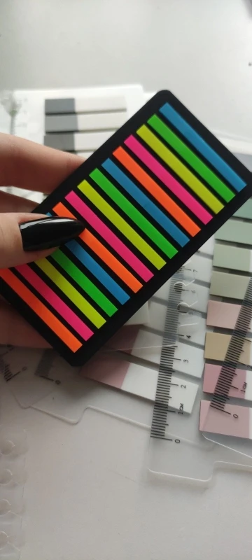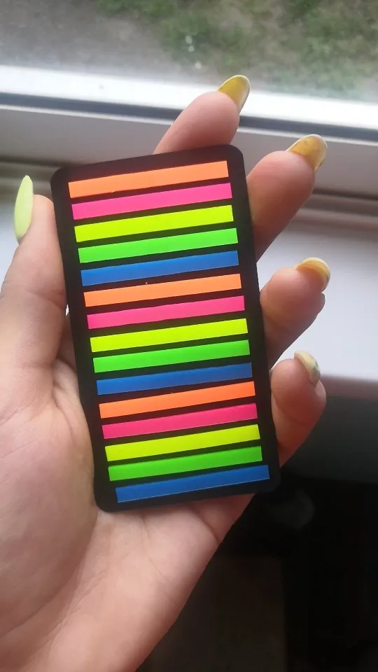 Всё отлично, закладки пластиковые, не бумажные (для меня это было важно) цвет темнее чем на фото, пришли быстро
