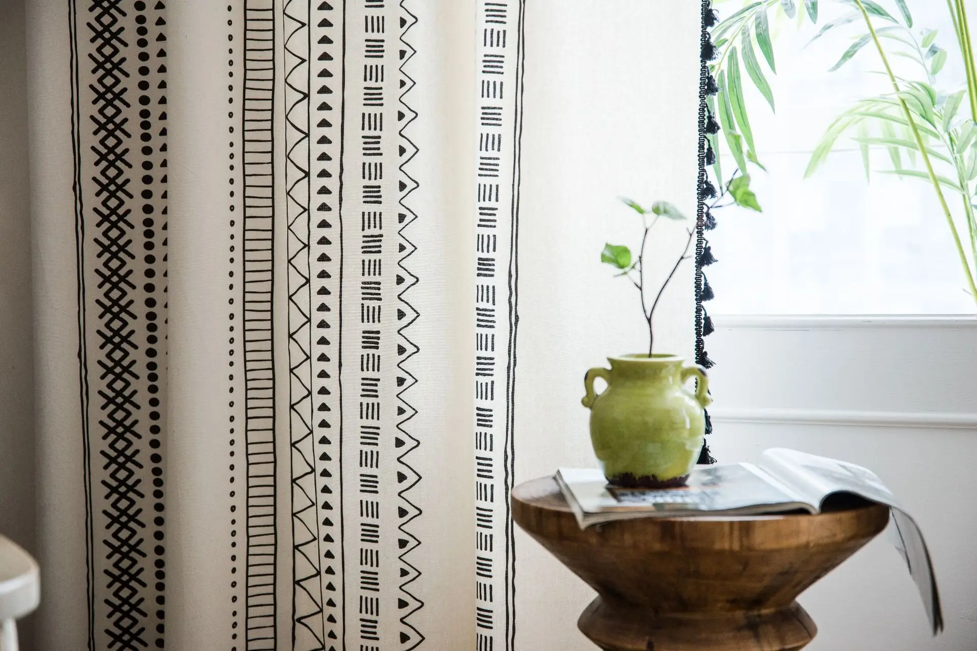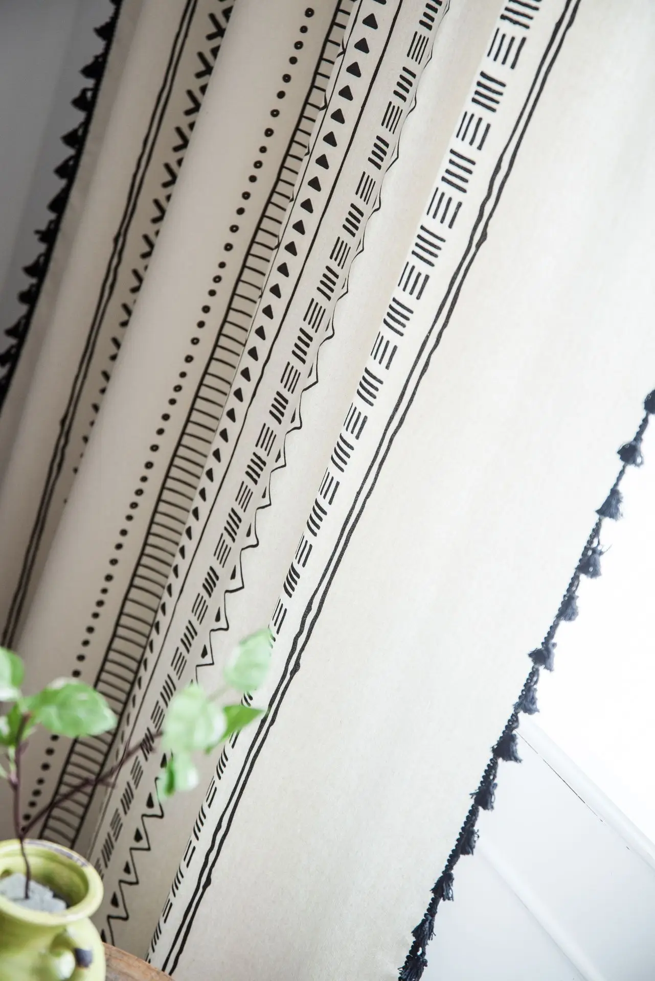 Шторы на окна из хлопка и льна с черной кисточкой в богемном стиле