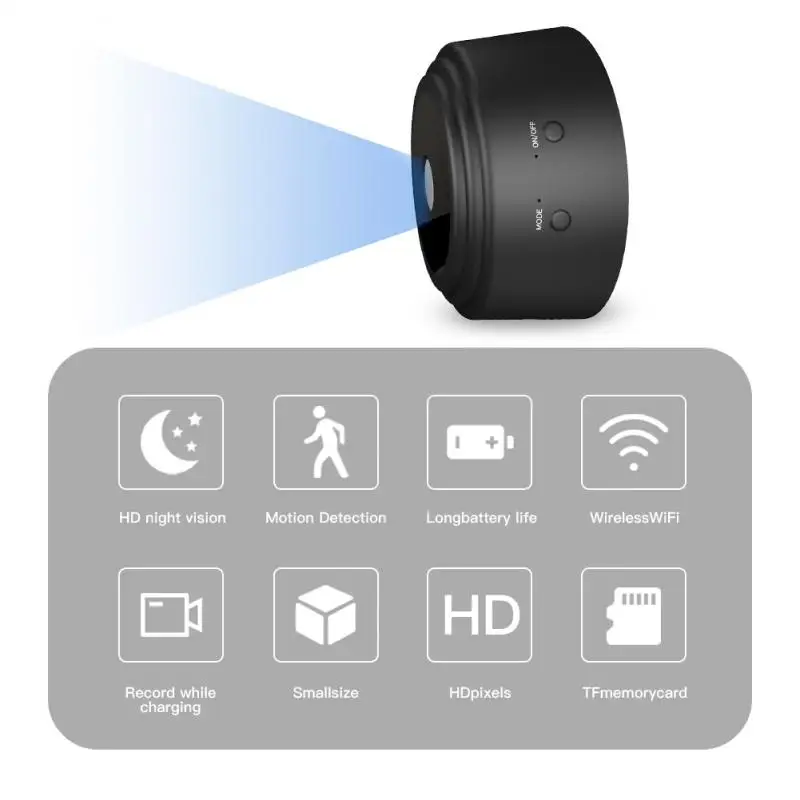 -Эта маленькая ванная комната имеет встроенный Магнит, может хорошо работать с любым железным материалом, легко помещается в любом месте. Эта маленькая камера с жестким зарядным кабелем и волшебным основанием, при зарядке во время записи, вы можете вручную повернуть угол записи на 360 градусов.