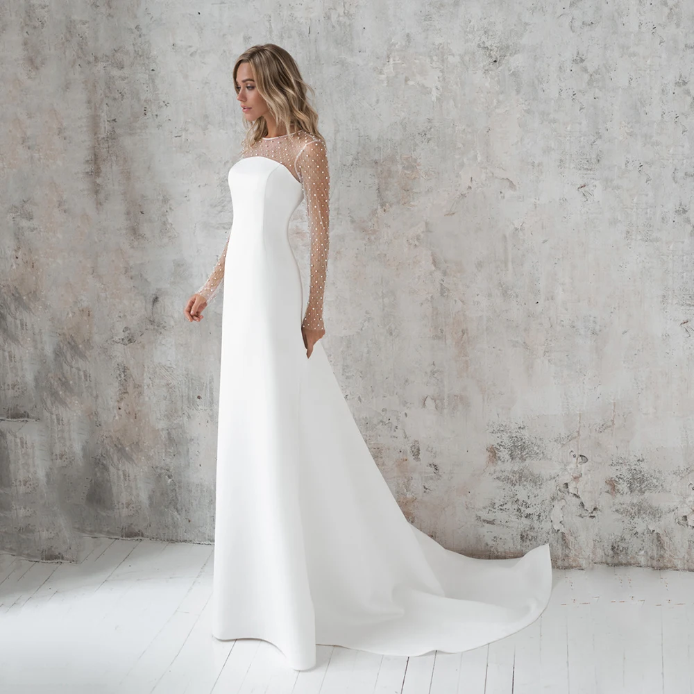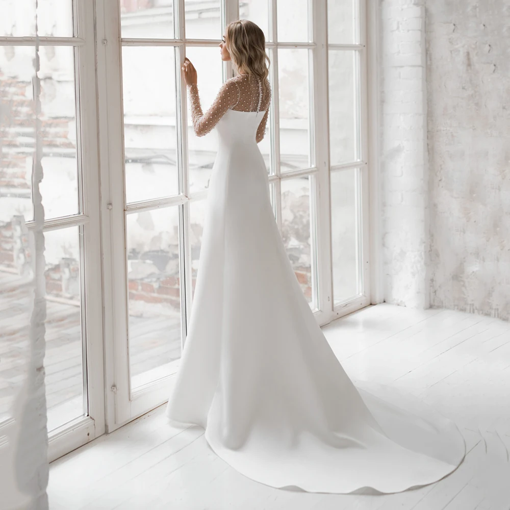 UZN сатиновое свадебное платье с О-образным вырезом одежда с длинным рукавом молоток свадебное платье с жемчугом Элегантное свадебное платье с низким вырезом на спине и кнопки