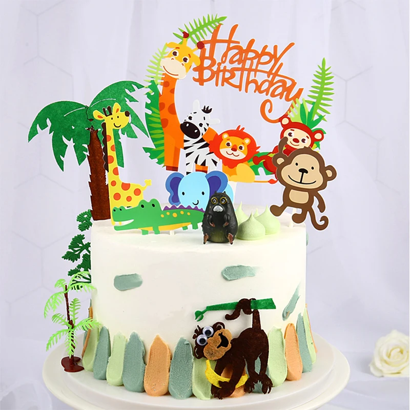 Топпер для торта С Днем Рождения в джунглях, сафари, животные, украшение торта, жираф, Лев, украшение торта, для дня рождения, для детей, мальчиков и девочек