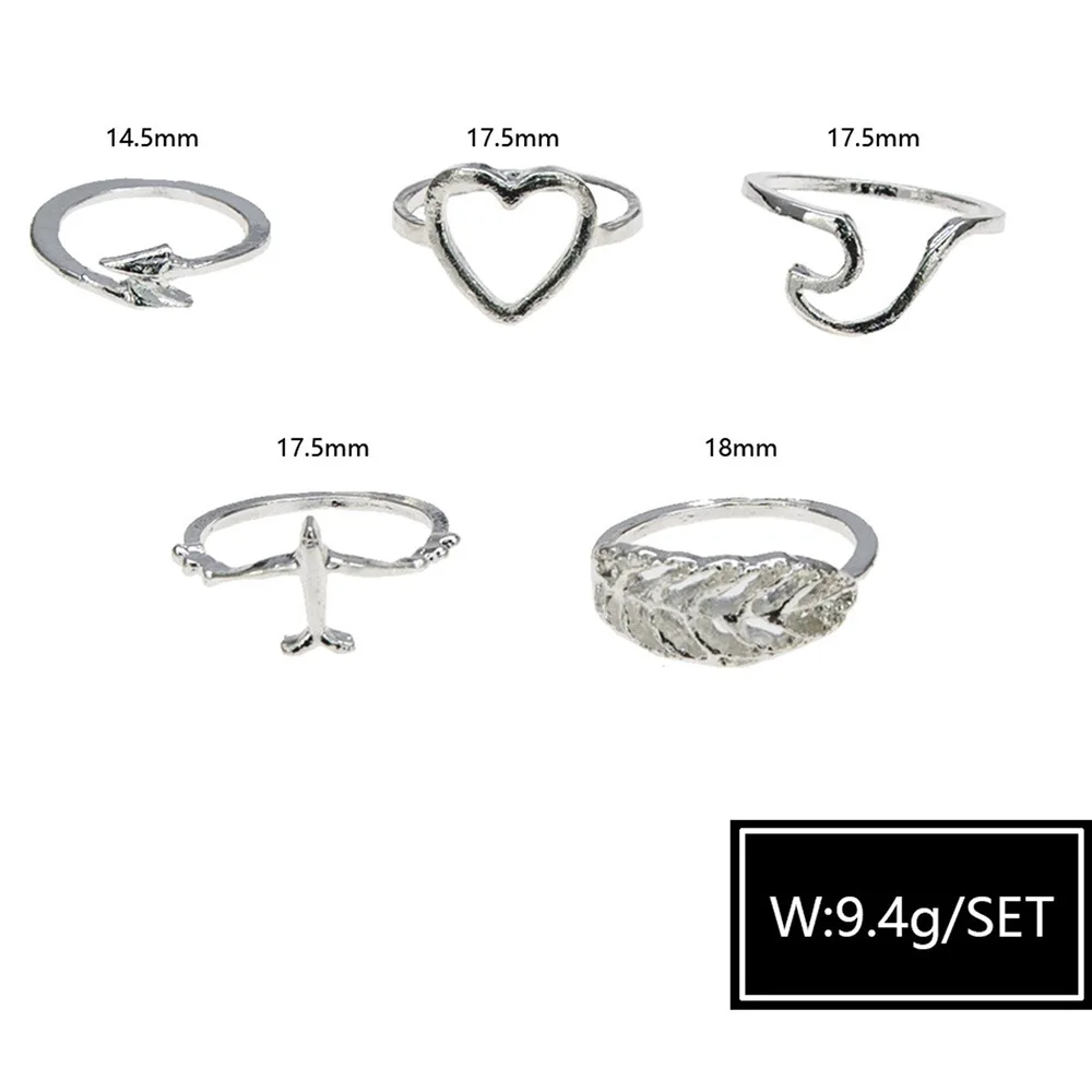 5 шт./компл., женские кольца на средний палец, кольцо на палец, серебряная, в стиле бохо, цветное кольцо в форме самолета, птицы, сердце, набор, винтажное ювелирное изделие, кольца в форме листьев
