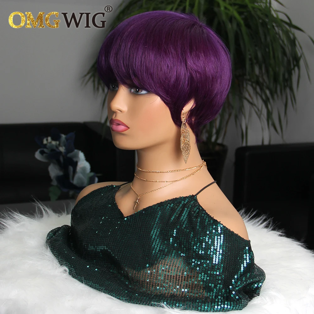 Фиолетовый цвет короткий парик вырезать Пикси перуанские человеческие волосы парик для чернокожих женщин полная машина без шнурка передние человеческие волосы парики боб прямые