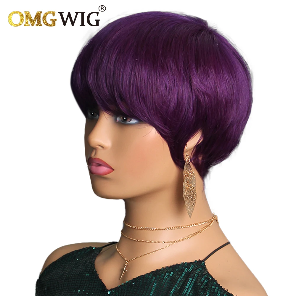 Короткий парик фиолетового цвета, перуанский парик из натуральных волос Пикси для чернокожих женщин, без шнуровки спереди, прямой парик Боб