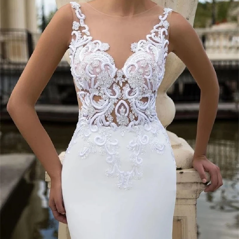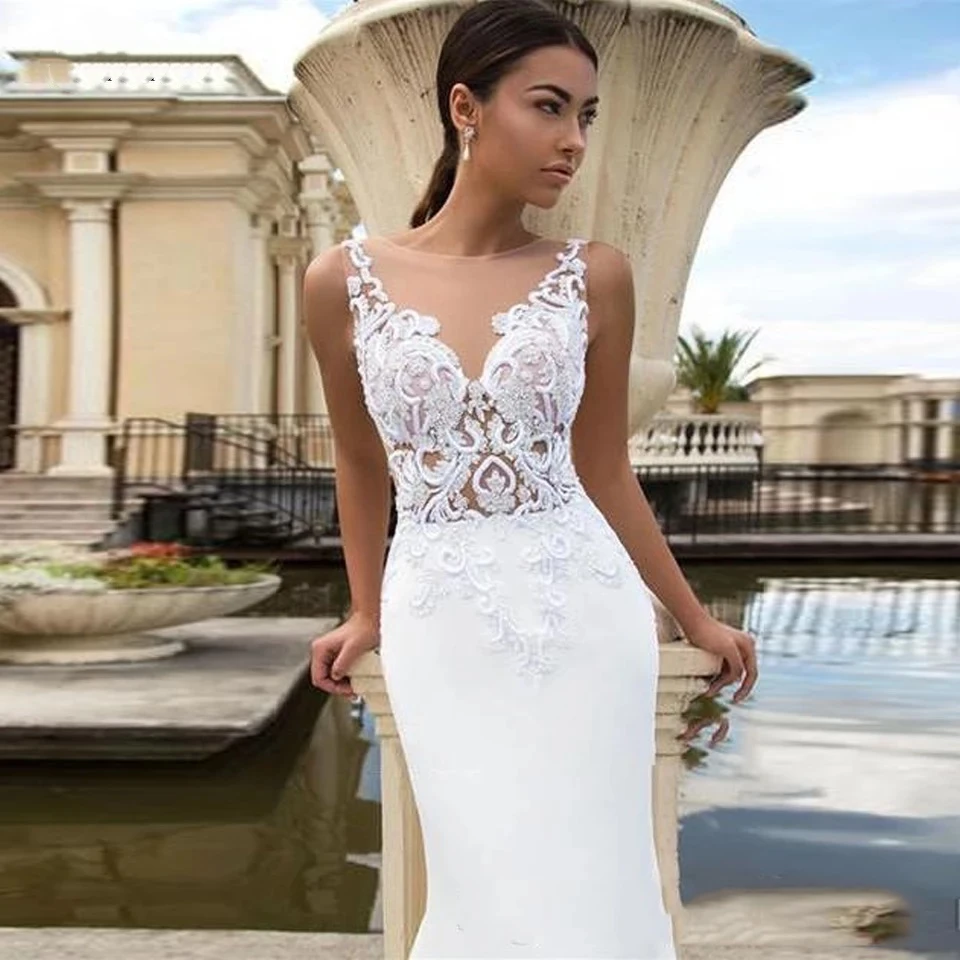Элегантное свадебное платье русалки 2021, прозрачное кружевное платье без рукавов с круглым вырезом и аппликацией, шифоновое платье невесты с пуговицами на спине