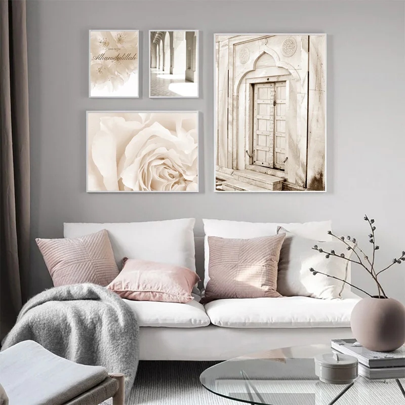 Настенная картина с цветами, бежевый холст, постер с цитатами, араб...