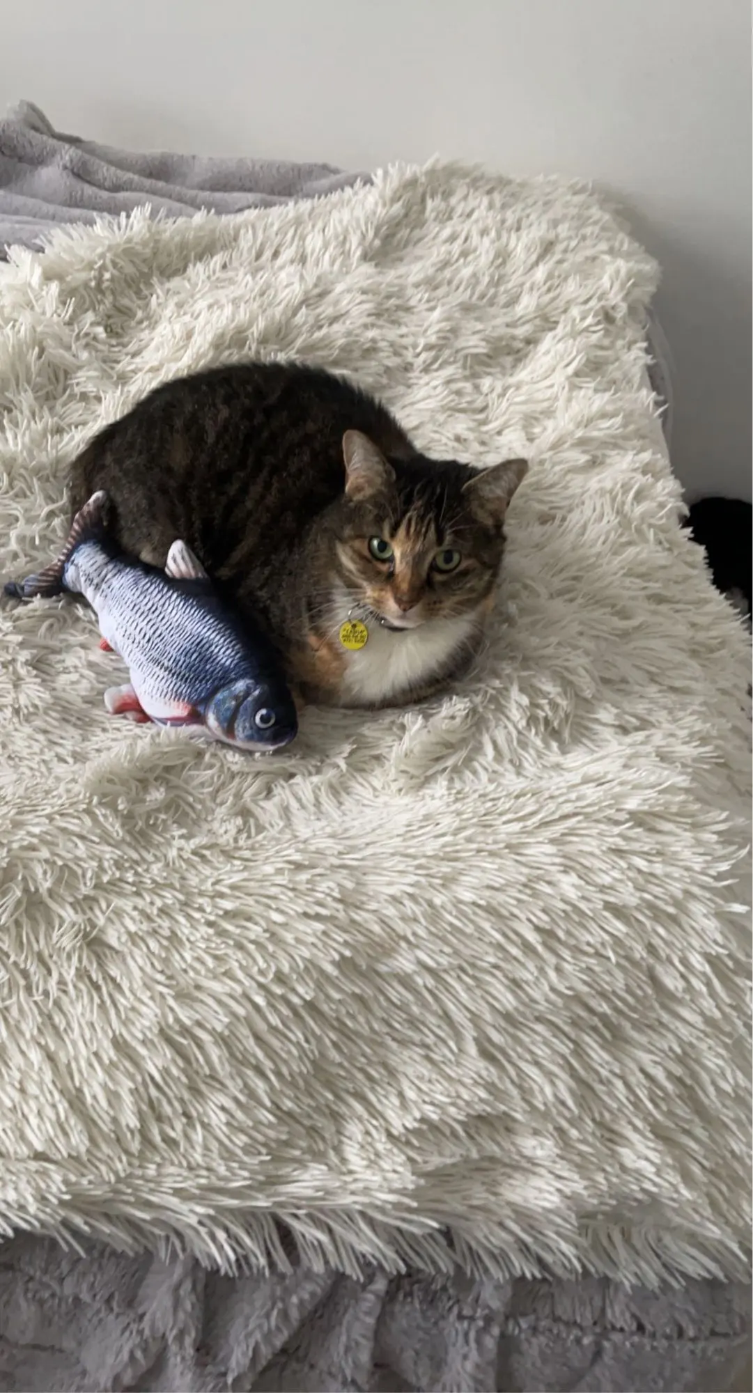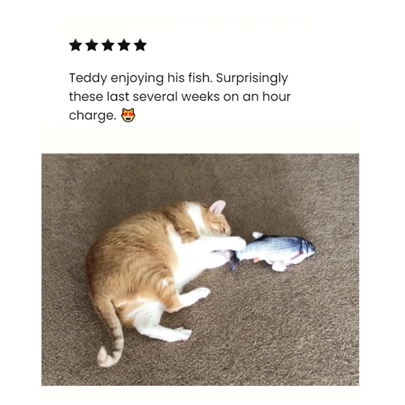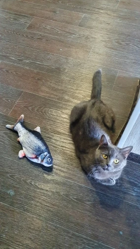 Кошки не проявили особого интереса, одна играет временами, вторая игнорирует. Рыба прекращает работать, когда кошка её долго не трогает - это плюс, не надо самому выключать. В комплекте провод микро-usb и мешочек с кошачьей мятой.