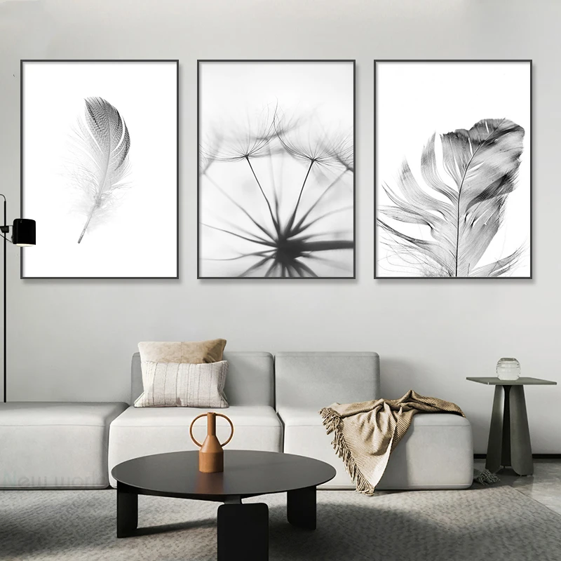 Плакаты с черно-белым цветочным принтом, настенное искусство, изображения растений, Листьев, перьев, одуванчиков, холст, украшение для гостиной, настенные картины