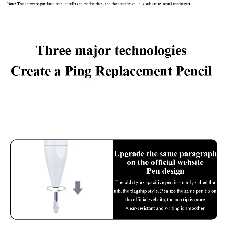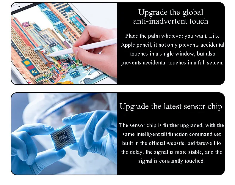 Обновите тот же пункт на официальном веб-сайтеДизайн ручкиЕмкостная ручка в старом стиле хорошо называется наконечником, флагманским стилем. Поймите тот же наконечник ручки на официальном сайте, наконечник ручки более износостойкий и более плавныйОбновите Глобальный анти-случайное касаниеПоместите ладонь куда угодно. Как и Apple pencil, он не только предотвращает случайные касания в одном окне, но и предотвращает случайные касания в полноэкранном режиме.Обновите новейший чип датчикаЧип датчика дополнительно модернизирован, с той же умной функцией наклона, построенной на официальном веб-сайте, попрощайтесь с задержкой, сигнал более стабильный, и сигнал постоянно тронут.