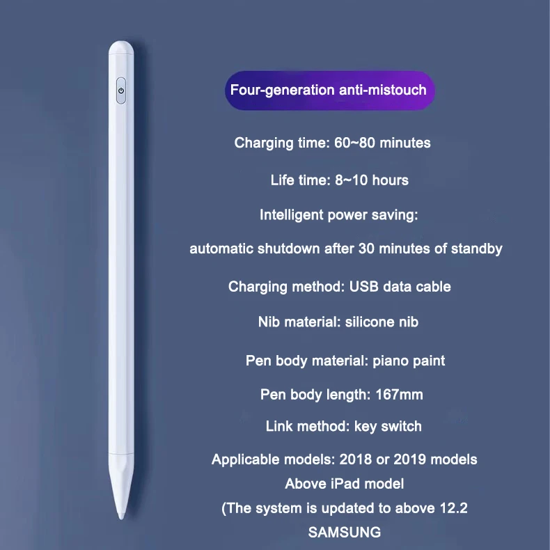 Время зарядки: 60 ~ 80 минутСрок службы: 8 ~ 10 часовИнтеллектуальная Энергосбережение: автоматическое выключение после 30 минут работы в режиме ожиданияСпособ зарядки: usb-кабель для передачи данныхМатериал наконечника: силиконовый наконечникМатериал корпуса ручки: краска для фортепианоДлина ручки: 167 ммМетод соединения: клавишный переключательПрименимые модели: модели 2018 или 2019Выше модели iPad (система обновлена выше 12,2 SAMSUNG