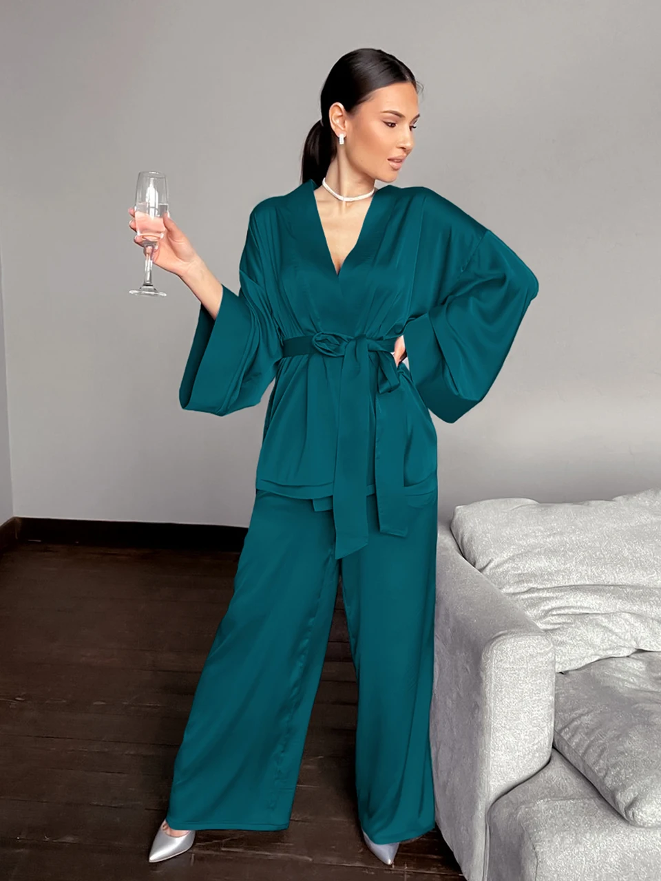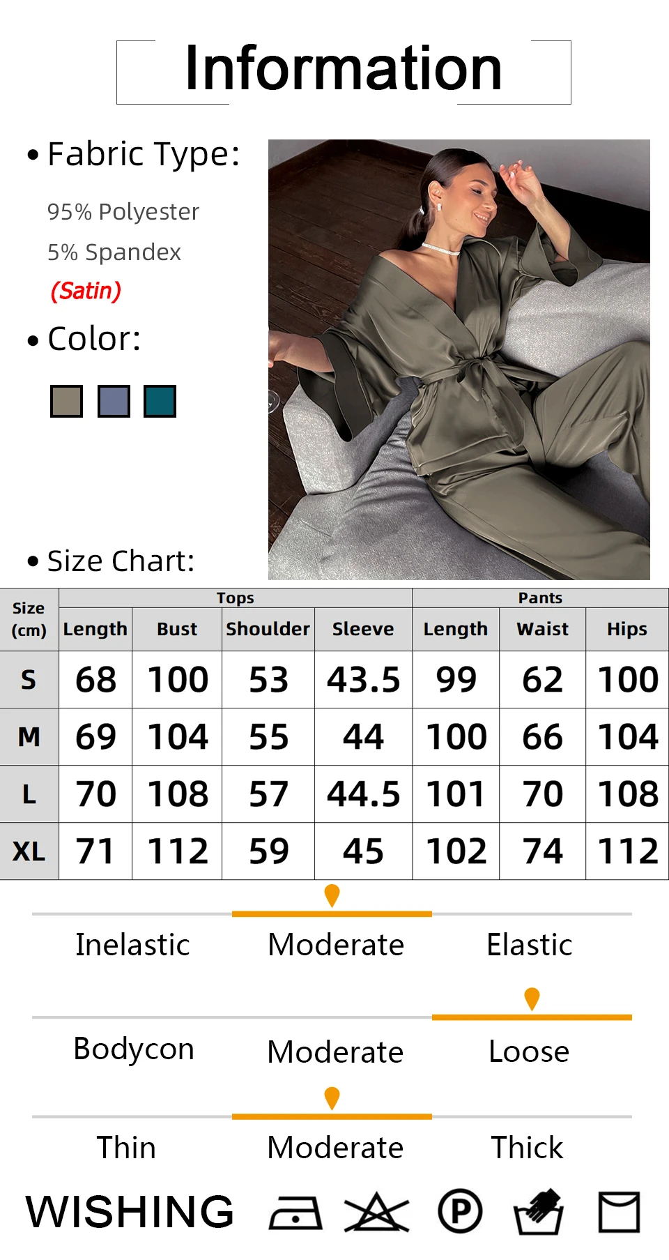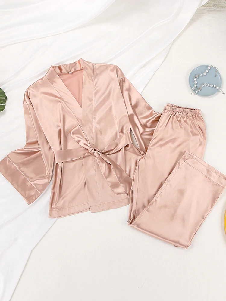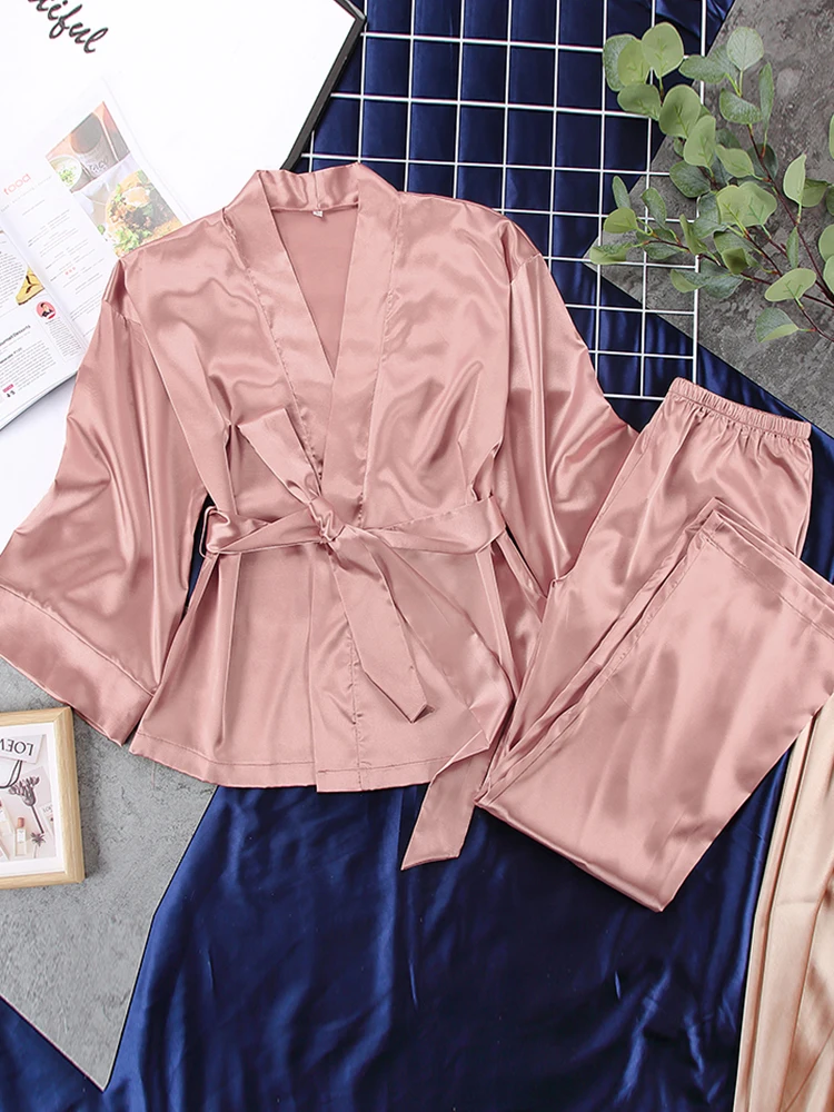 Однотонная Пижама, свободные расклешенные домашние брюки, комплект атласного халата с рукавом три четверти, женский халат, модная весенняя Пижама 2021
