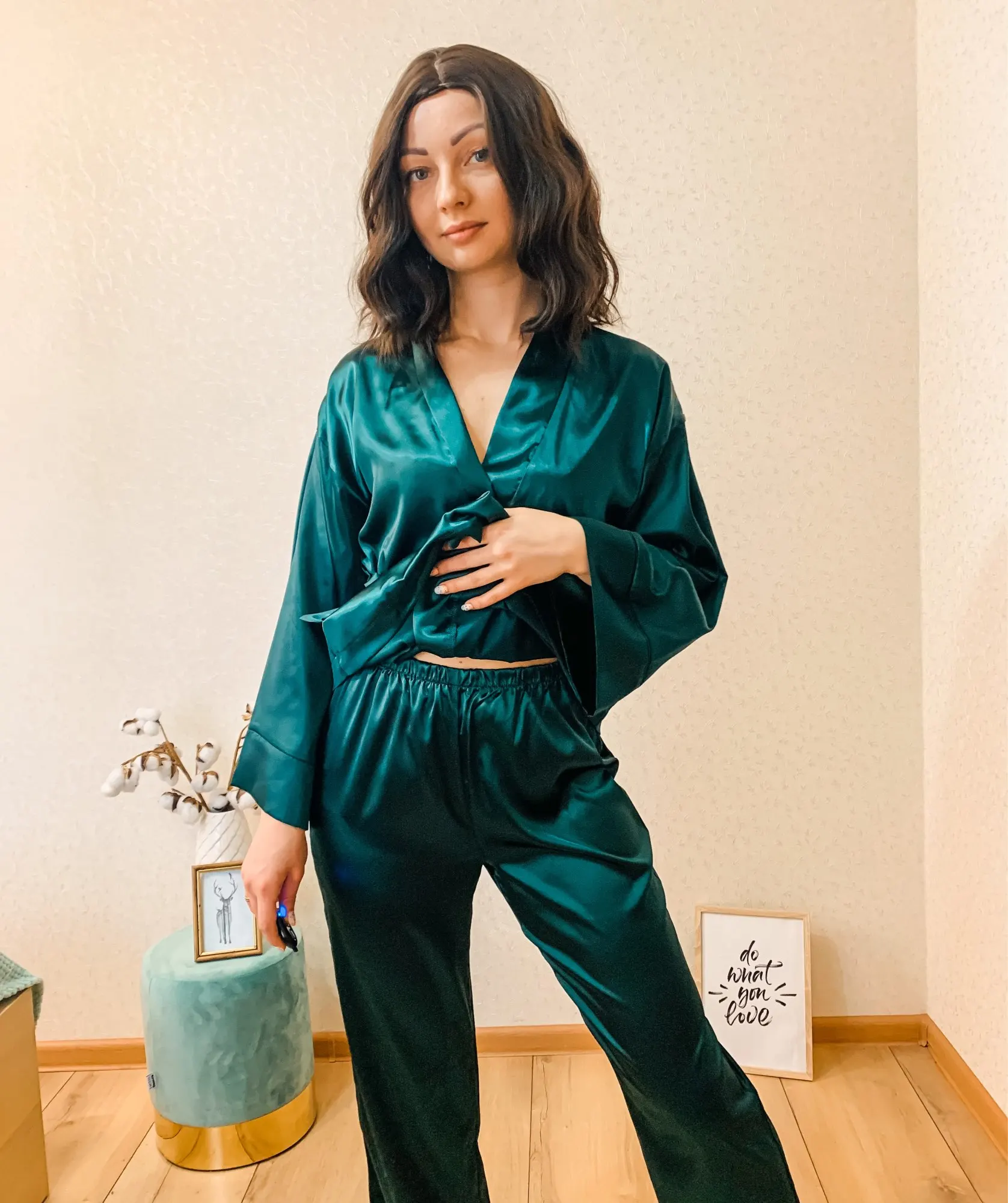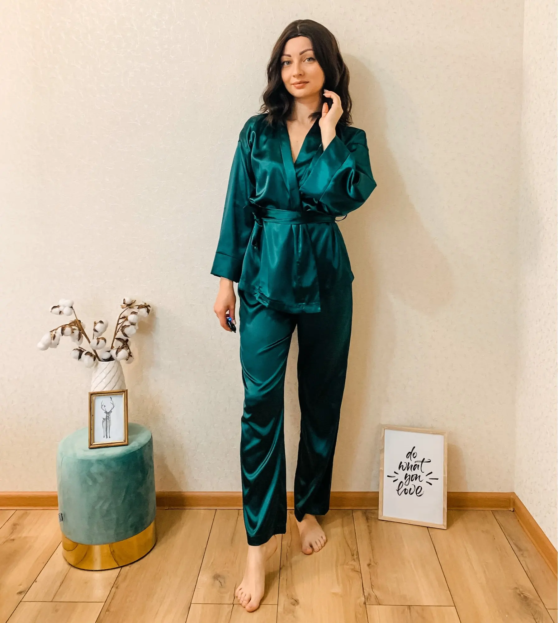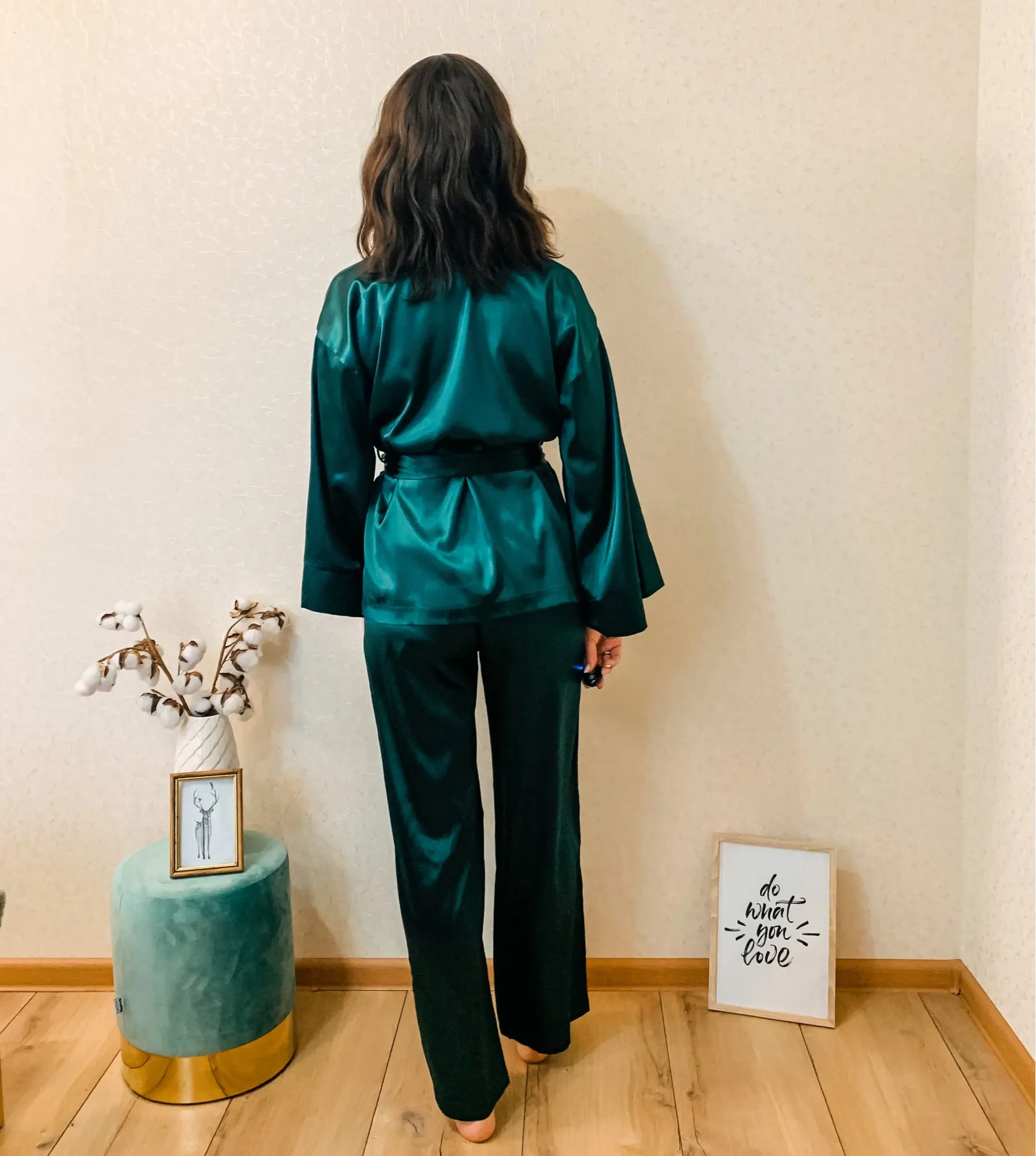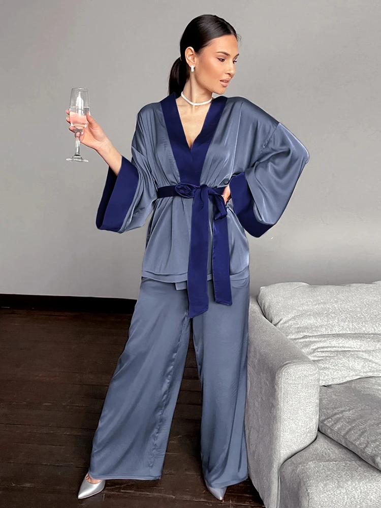 Однотонная Пижама, свободные расклешенные домашние брюки, комплект атласного халата с рукавом три четверти, женский халат, модная весенняя Пижама 2021