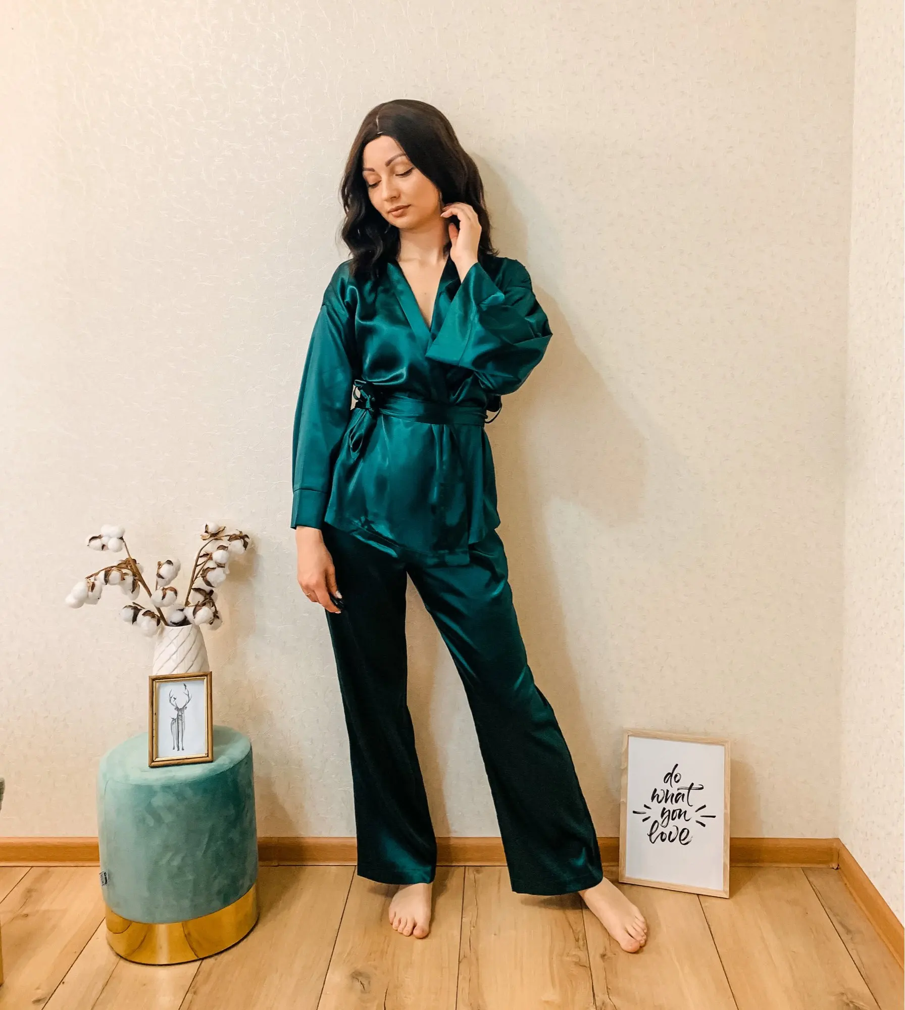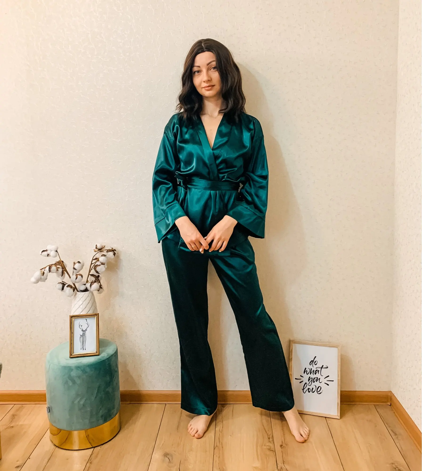 Видео в Inst :Ksenia.d.beauty Потрясающий комплект для дома или мне. Смотрится элегантно, к нему так и напрашивается бокал вина в руки Материал полиэстер, но он хорош. Нежный, струящийся, да ещё и тяжеленький На мои параметры 87-69-92 и рост 164 см размер М отлично подошёл. Брюки идеальны по длине. Штаны на эластичной резинке. Кофта с запахом, в комплекте идёт поясок из того же материала, есть шлевки под него. Качество пошива идеальное