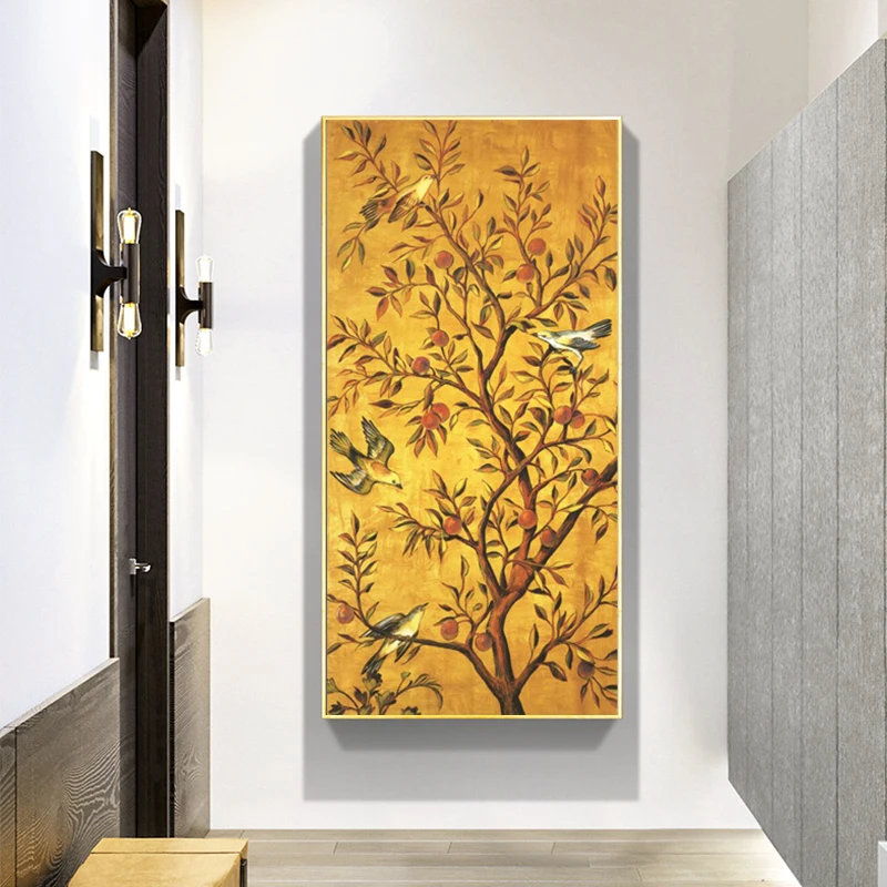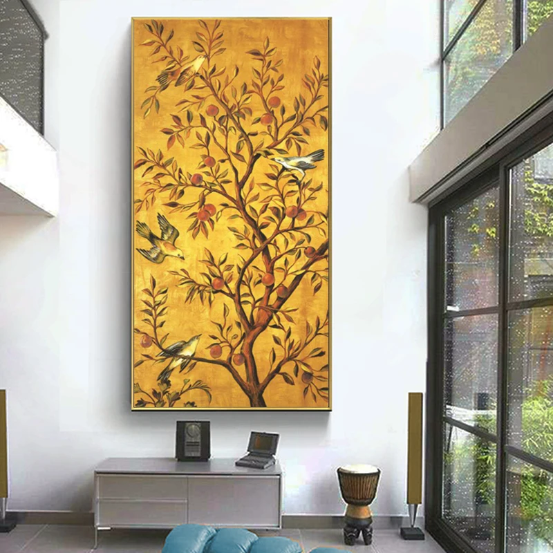 Традиционные картины на холсте с деревом удачи и птицами, постеры золотого и желтого цветов, настенные художественные картины для украшения гостиной и дома