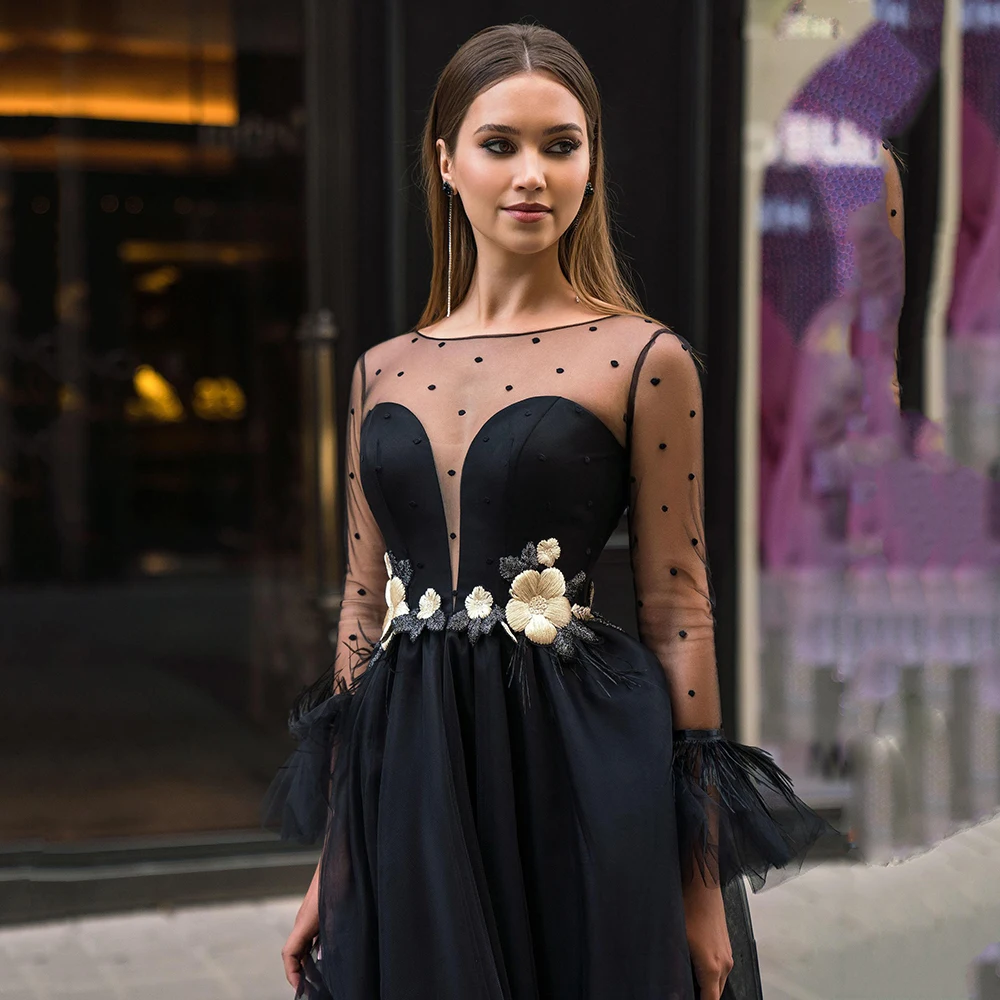 UZN элегантный А-линейное короткое вечернее платье с глубоким круглым декольте длинное вечернее платье с рукавами в горошек Чистая с цветочной аппликацией платье для выпускного вечера