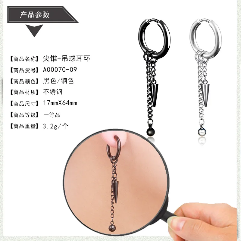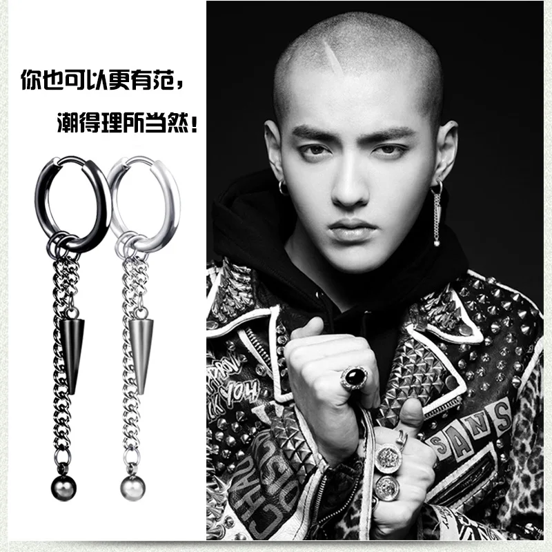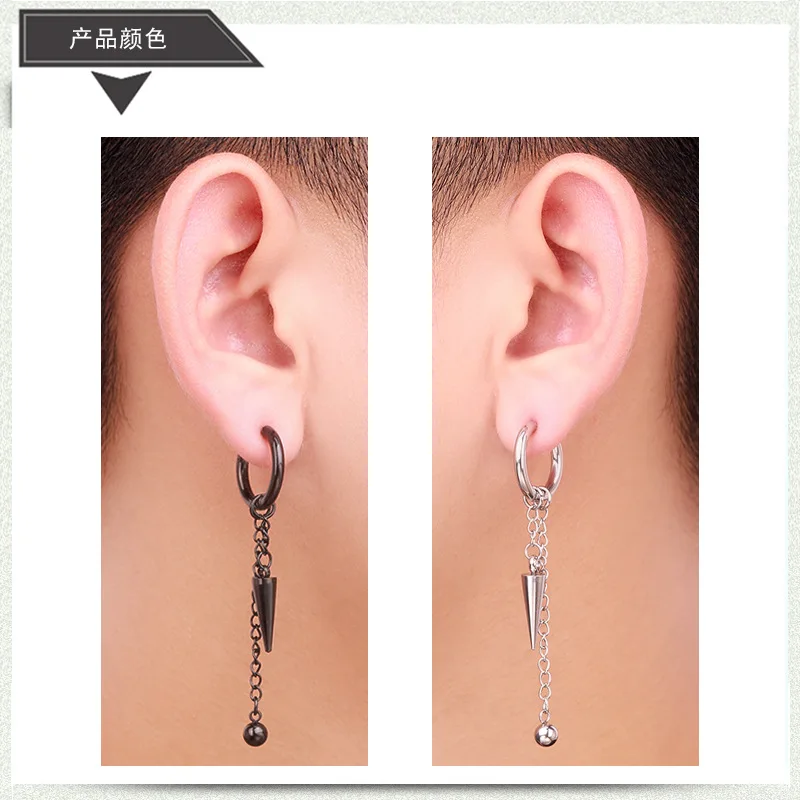 Мужской черный серьга в виде клипсы панк Стиль титановая сталь один цепочка с кулоном в виде конуса кисточкой битник для мужчин, модное ювелирное изделие, супер Hipster