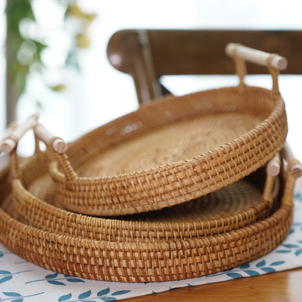 Круглый поднос из ротанга ручной работы, поднос с ручками для хранения еды, закусок, завтрака