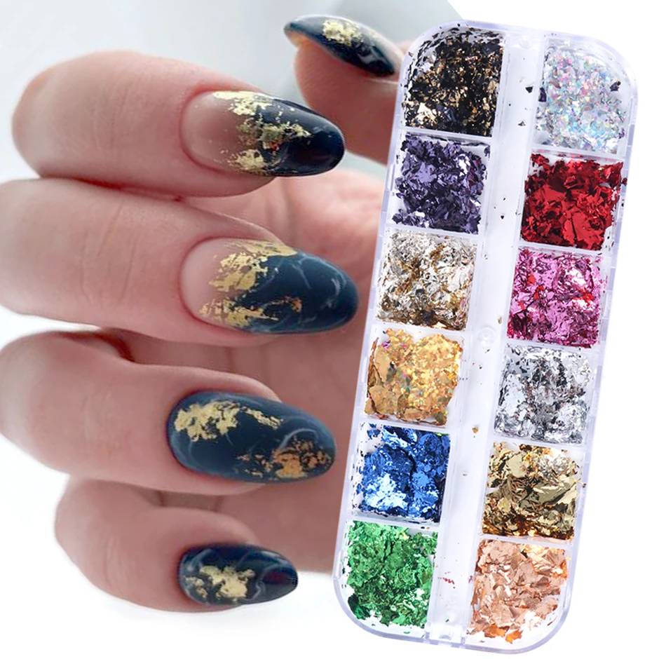 12 цветов, Золотая фольга, великолепные Блестки для ногтей, алюминиевый дизайн ногтей, блестящие Новогодние украшения для ногтей