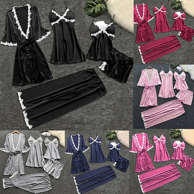 Комплект пижамный женский с цветочным принтом, комплект нижнего белья из 5 предметов, ночная рубашка шелковая одежда для сна