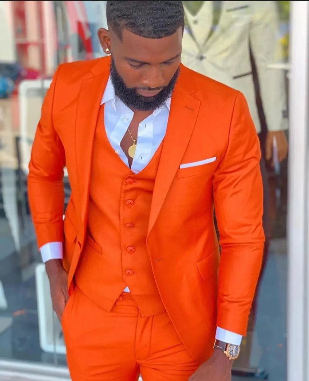 Самая последняя конструкция ярко-оранжевый мужские костюмы с заостренными лацканами мужской костюм для выпускного вечера, костюм-смокинг для свадьбы, выпускного жениха Блейзер Terno Slim Fit 3 предмета в комплекте