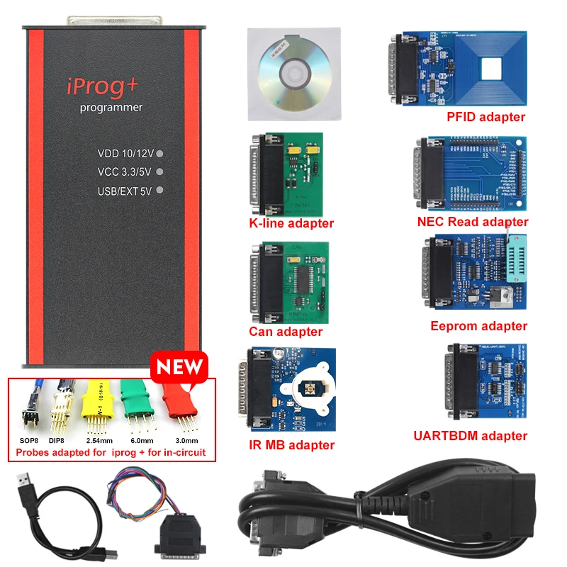 1 шт. x iprog + Основной блок 1 шт. x адаптер RFID 125 + 134 1 шт. x адаптер Eeprom 1 шт. x адаптер UARTBDM 1 шт. x Кабель OBD 1 шт. x USB 1 шт. x CD