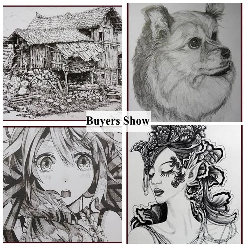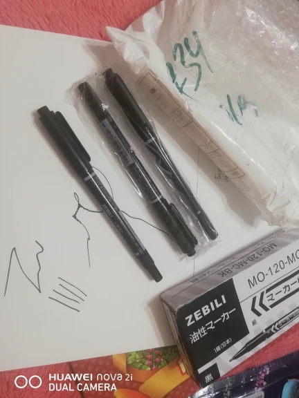 Доставка месяц. Упаковано хорошо и каждая ручка в пакетике чтоб не высохла. Совсем не то что ожидала. Просто фломастер двухсторонний. Толщина вроде разная, но пишут почти одинаково толсто и чернила обычную бумагу насквозь пропитывает, а на акварельной бумаге растикаеся в стороны и на бумаге для черчения тоже самое. Не совсем чисто черный, скорее темно при темно серый. Для моей работы не пойдёт, не как на фото продавца не для этого, для рисования не годится