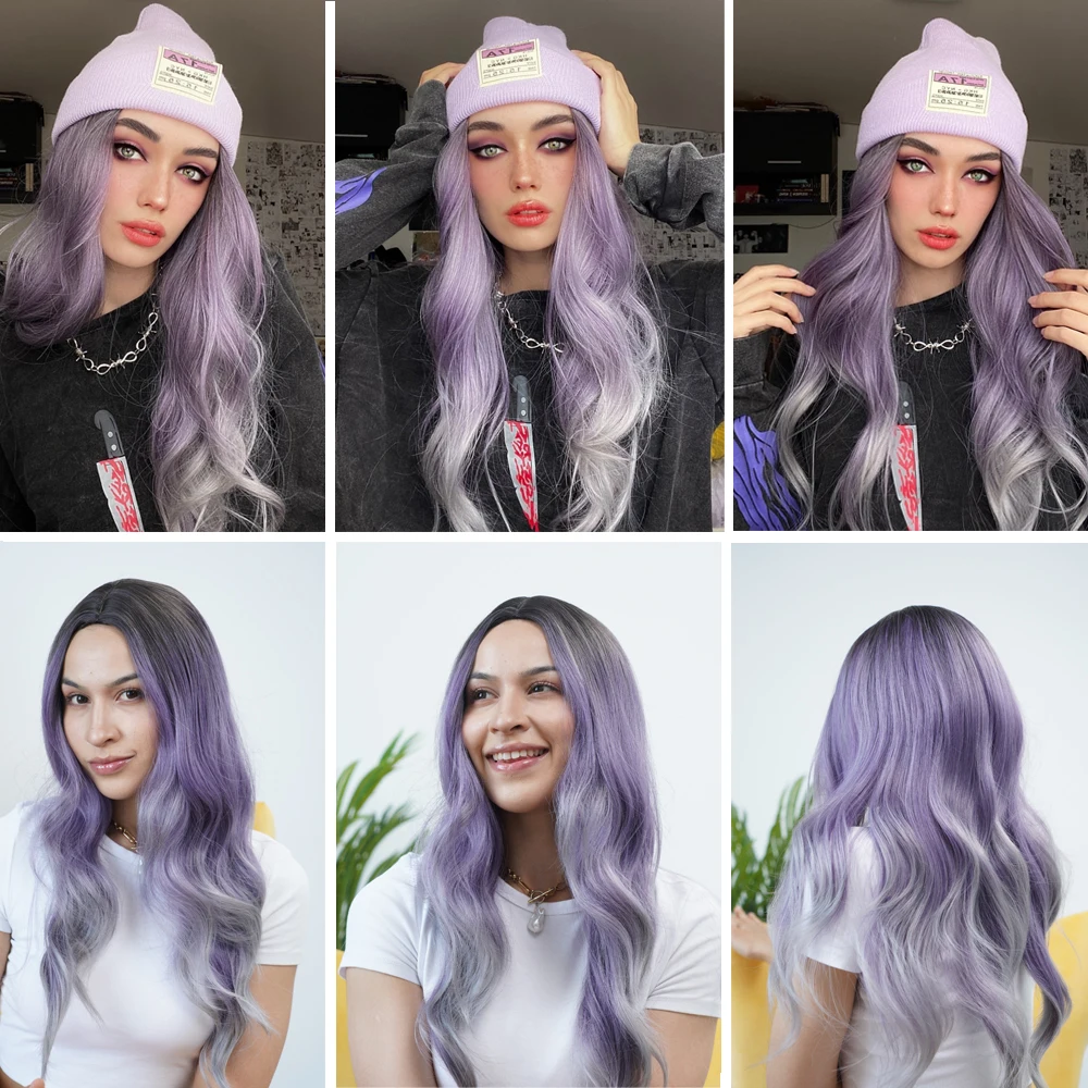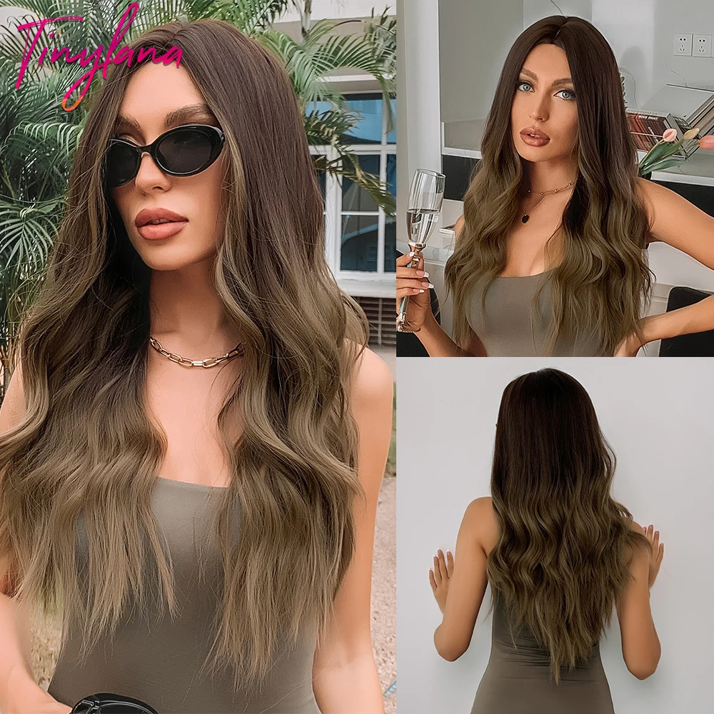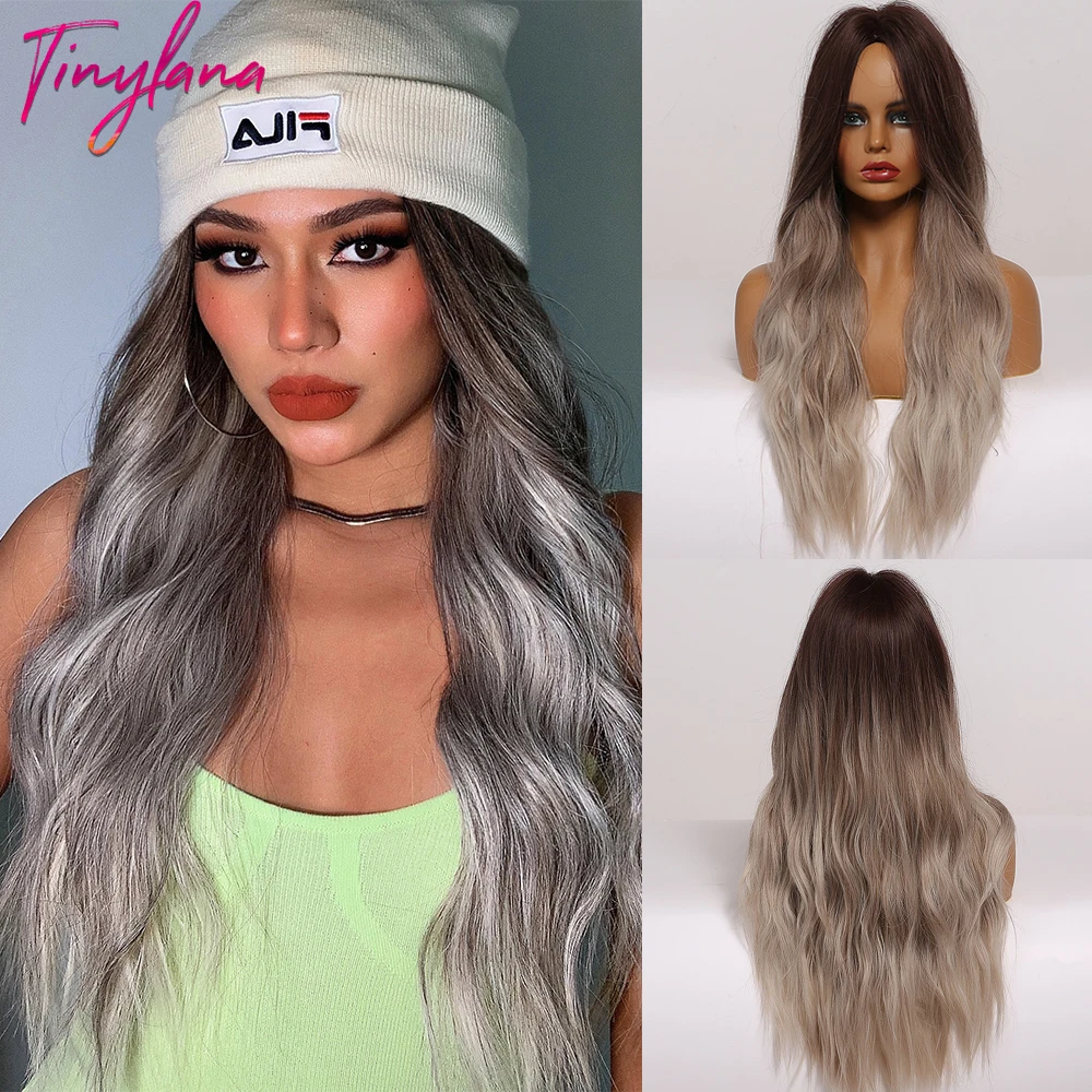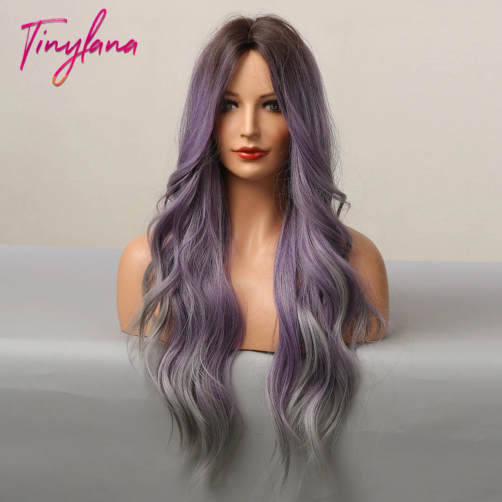 Крошечная Лана длинные Омбре коричневые фиолетовые серые волнистые парики средняя часть натуральные синтетические парики для женщин Косплей вечевечерние Термостойкое волокно