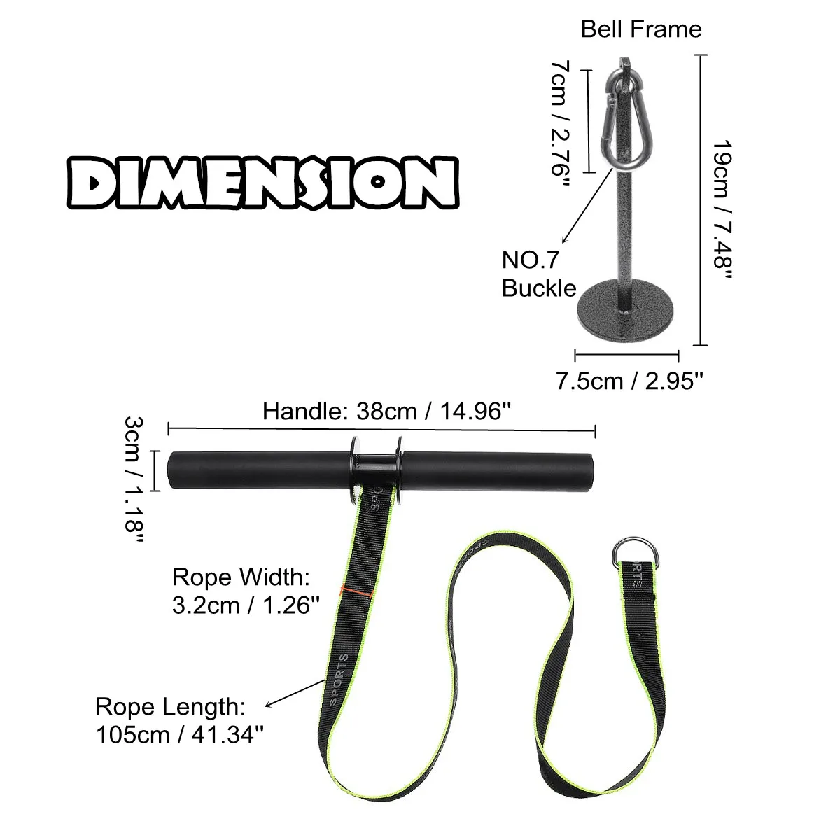 Характеристики:Цвет: черныйНесущая нагрузка: 150 кгМатериал: сталь + нейлон + ЭваNo.7 Железная пряжка: 7 см/2,76 дюймаРучка: (Dia. x L) 3x38 см/1,18x14,96 дюймаВеревка: (Ш x д) 3,2x105 см/1,26x41,34 дюймовКолокол рамки: (диам. Ширина х высота) 7,5x19 см/2,95x7,48 дюймов
