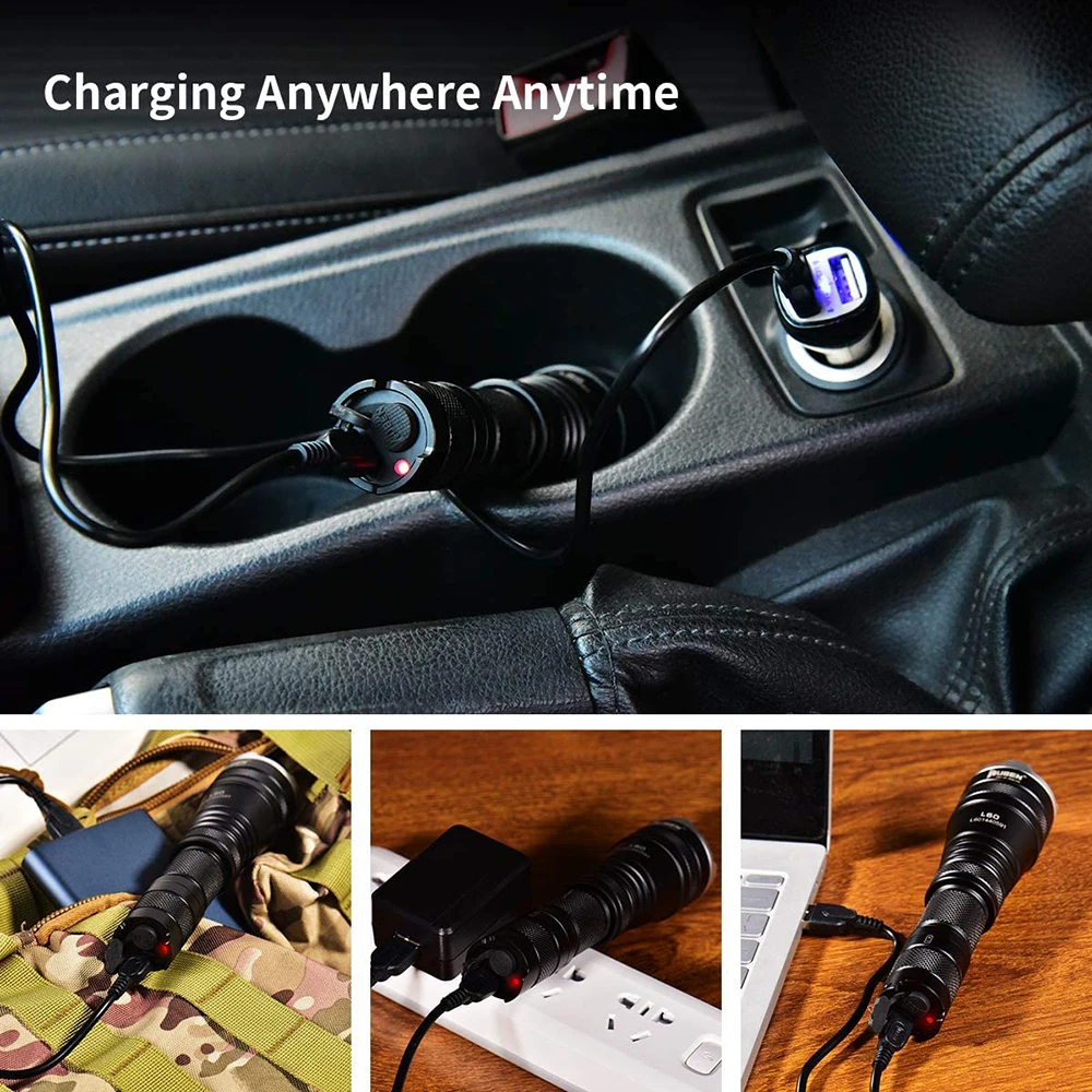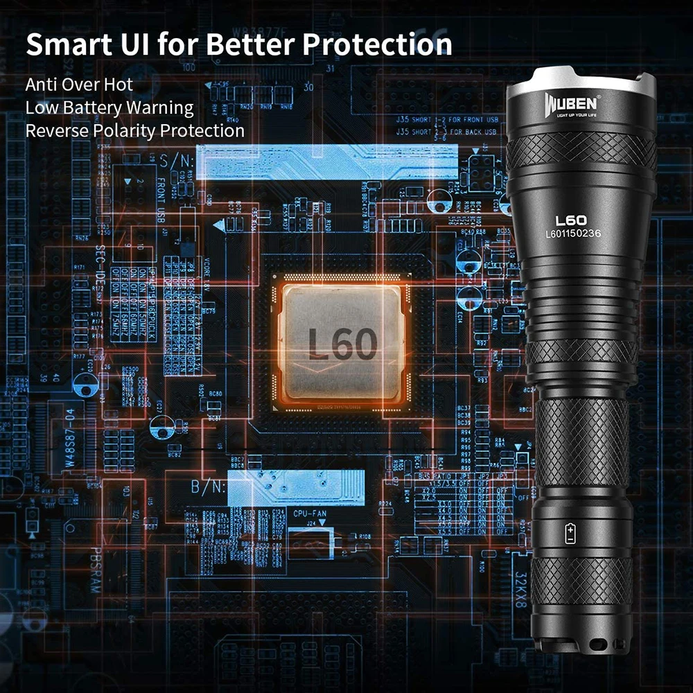 Фонарик WUBEN L60 изготовлен из твердого анодированного алюминиевого сплава класса 6061 и является водонепроницаемым и пыленепроницаемым IP68, что делает фонарик очень прочным и жестким. Этот фонарик имеет умную функцию предупреждения о низкой мощности, чтобы напомнить вам о его зарядке. Когда батарея работает менее 30 минут для текущего режима, фонарик мигает каждые 5 минут, пока батарея не закончится. Когда фонарик заряжается, есть светодиодный индикатор состояния зарядки.