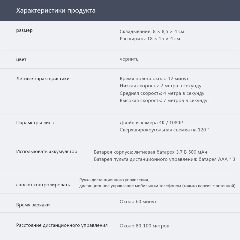 Номера товара: LS-XT6Размер продукта: в сложенном виде: 8*5,5*4 см, открытые: 18*15*4 смЦвет коробка Размер упаковки: 22*15,5*6 смСумка для хранения Размер: 21,5*11*7 смАккумулятор пульта дистанционного управления: 1,5 в ААА батареи * 3 (не прилагаются)Батарея корпуса: 3,7 V 500Mah литиевая батареяВремя зарядки: 60 минутВремя полета одной батареи: около 12 минутСпособ зарядки: usb-кабель для зарядкиРасстояние дистанционного управления: 80-100 метровМодель двигателя: 716 Бескаркасный моторМатериал изделия: пластиковые металлические электронные компонентыЧастота приема: 2,4GКоличество каналов: 4-канальный видеорегистратор с шестью осями гироскопРазрешение: 1080P / 4KУгол линз: 180 градусов до 90 градусов регулируетсяОбратное расстояние: 15-30 метровРежим дистанционного управления: левая дроссельная заслонкаСписок товаров:Дрон * 1 пульт дистанционного управления * 1 лопасть вентилятора * 2 защитного кольца * 4 держатель на мобильный телефон * 1 аккумулятор * 1 usb-кабель * 1 Руководство * 2Характеристика:1: рукоятка Складная, небольшая по размеру и легко носить с собой.2: он имеет функцию поддержания высоты, и полет стабильный.3: в безголовом режиме нет необходимости регулировать положение самолета перед полетом.4: Используйте функцию возврата одной кнопкой, чтобы легко найти путь домой.5: встроенная камера высокой четкости 500 Вт/4K пикселей, удивительно, она может снимать удивительные фотографии и видео с воздуха.6: с функцией Wi-Fi, он может быть подключен к приложению и системе APK, и делать фотографии, видео и передачу в режиме реального времени через мобильный телефон камеры изображений.7: нарисуйте траекторию полета на экране, и Дрон будет летать автономно по указанному пути.8: 2,4 ГГц анти-помех технологии.9: 4 канала, способные скалолазание, спуск, вперед, назад, левая, правая и 360 ° рулон.10: шестиосевой гироскоп, полет более стабильный, и управление более удобно.11: светодиодный светильник делает полет более эффектным, особенно в темноте.Функции s: вверх/вниз, вперед/назад, влево/вправо, боковой полет, светодиодный свет, режим Безголового движения, автоматическое возвращение одной кнопкой, режим удержания высоты, wiFi FPV (двойная камера с функцией переключения с двумя объективами) объектив)