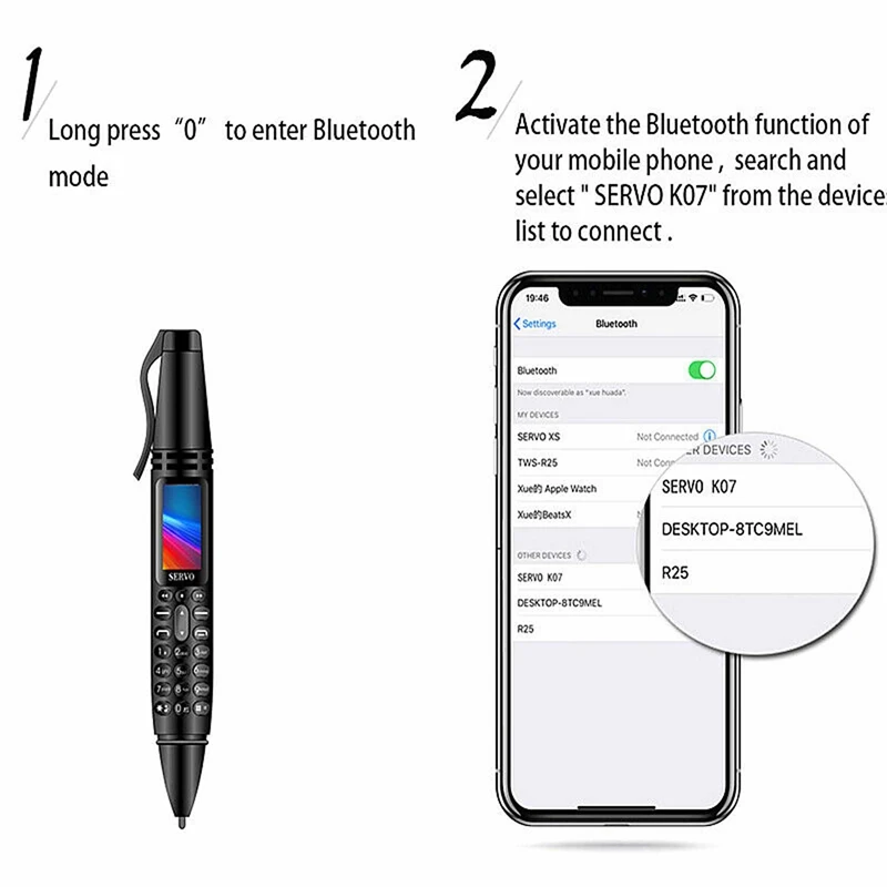 Характеристика:1. 0,96 дюймовый крошечный экран2. Расстояние управления bluetooth (10 м)3. Здоровая жизнь ультра-низкое излучение4. Две sim-карты, два режима ожидания (2 Nano sim-карты, 1 TF карта памяти)5. Ручка для записи6. Карта памяти (максимальная поддержка 32 Гб расширения)7. Размер: 117*21 мм (вес 33 г)8. Bluetooth-дозвон, Синхронизация контактов, вы можете получить номер входящего звонка/КОНТАКТНОЕ сообщение9. Язык: английский, русский, французский, итальянский, арабский, немецкий, испанский, португальский, вьетнамский, турецкий, иврит, польский.10. SERVO K07 с шариковой ручкой (почерк)11. Bluetooth-дозвон (нажмите «0», чтобы войти в режим bluetooth)Синхронизация контактов, вы можете получить номер входящего звонка/КОНТАКТНОЕ сообщение12. С камерой 0.3MP, разрешение дисплея 80*160P(ROM только 32 Мб, нет достаточно памяти, и вам нужно установить карту памяти.)13. Длительное нажатие кнопки «вверх», включите фонарик14. Fm-радио (без необходимости подключения наушников)15. Зарядка (Micro USB)16. Нажмите «1», чтобы войти в функцию записи17. Пожалуйста, отсканируйте qr-код (изображение ниже) или найдите «BTNotification», чтобы загрузить приложение. Функция удаленного захвата может быть активирована путем подключения SERVO K07 через приложение «BTNotification».(Функция удаленного захвата доступна только для смартфонов Android)