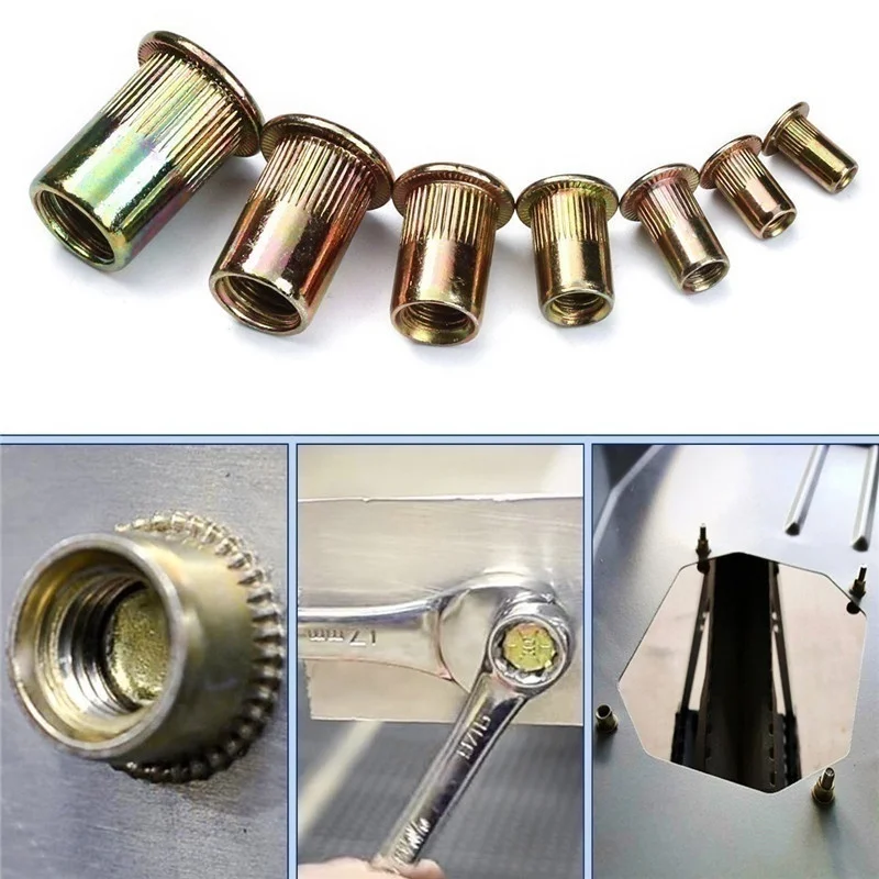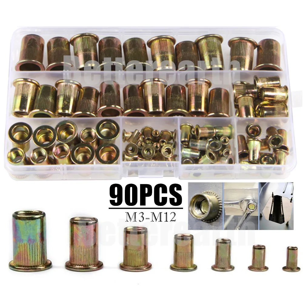 90 шт. M3 M4 M5 M6 M8 M10 M12 оцинкованная углеродистая Сталь гайкой с накаткой Rivnut плоской головкой заклепки с резьбой вставка из нержавеющей стали Nutsert Кепки заклепочная гайка