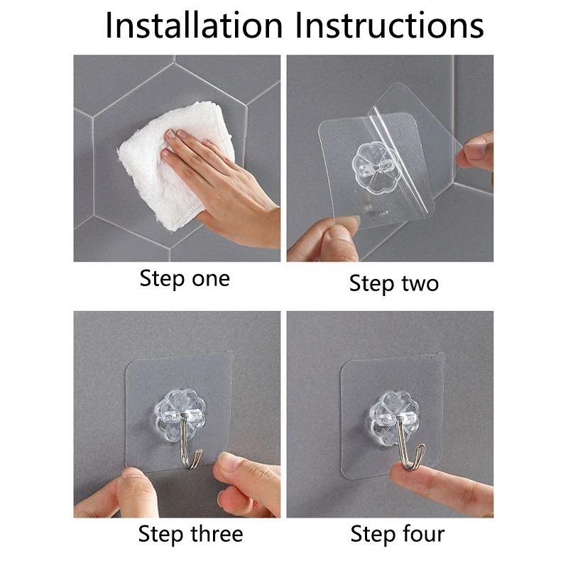 1. Протрите стену2. Оторвите клейкую защитную пленку3. Положите его на стену, чтобы выпустить воздух4. Крючок из нержавеющей стали может вращаться и выдерживать хорошую нагрузку