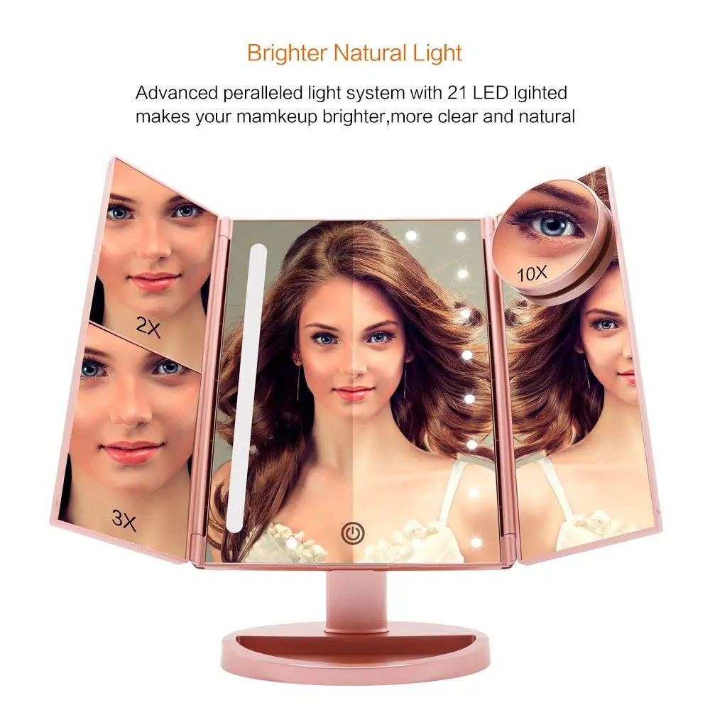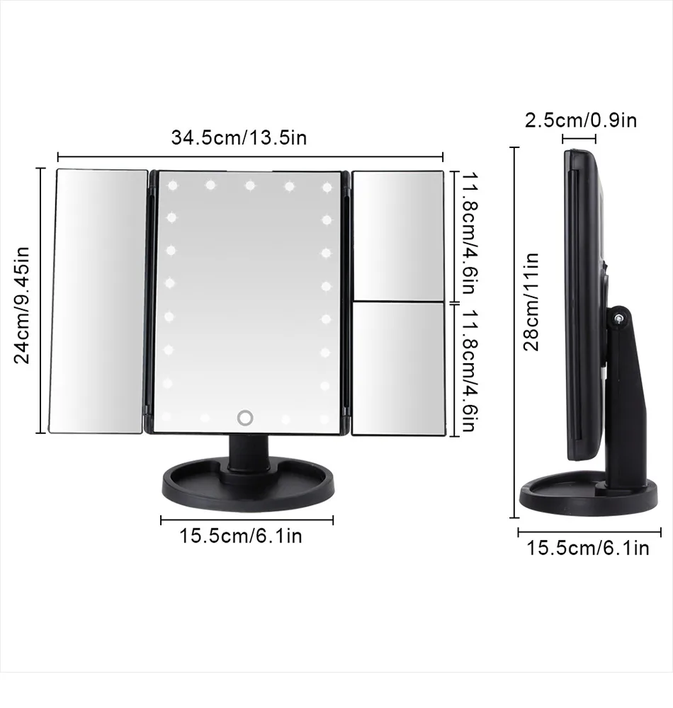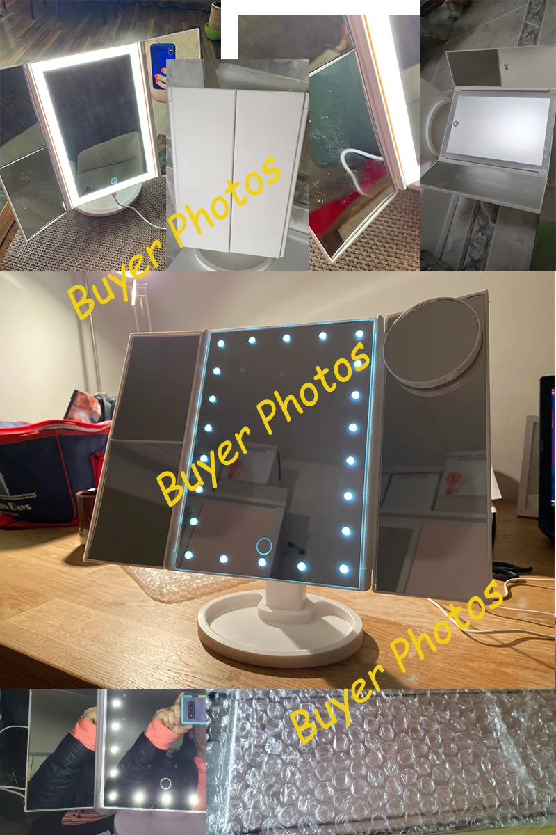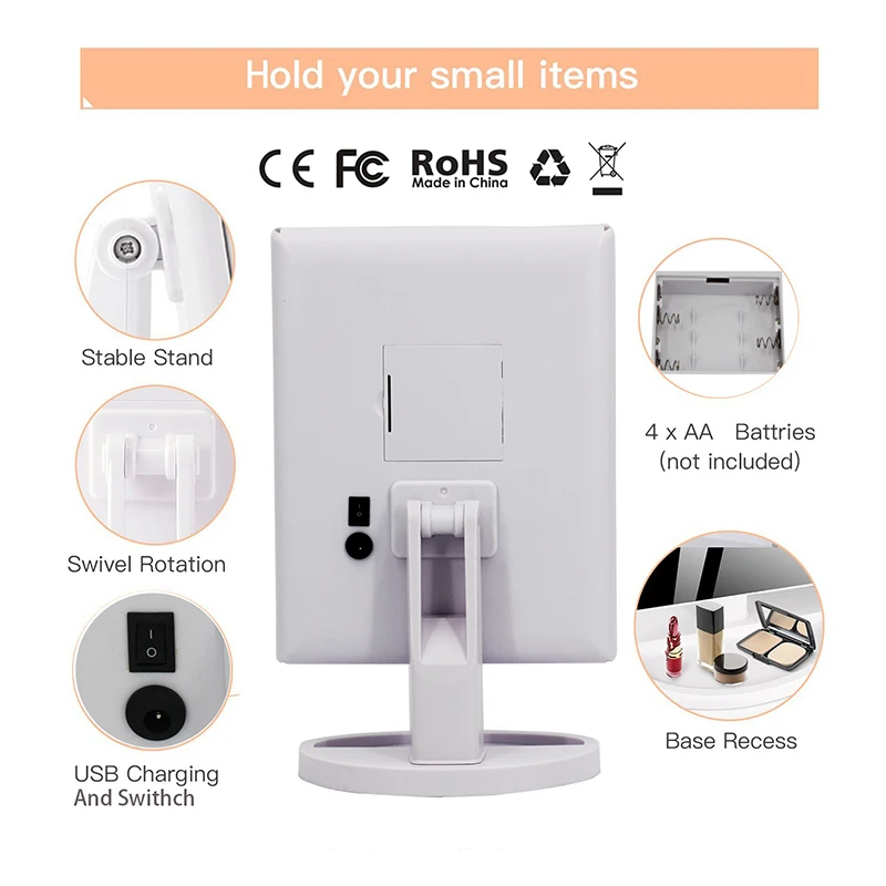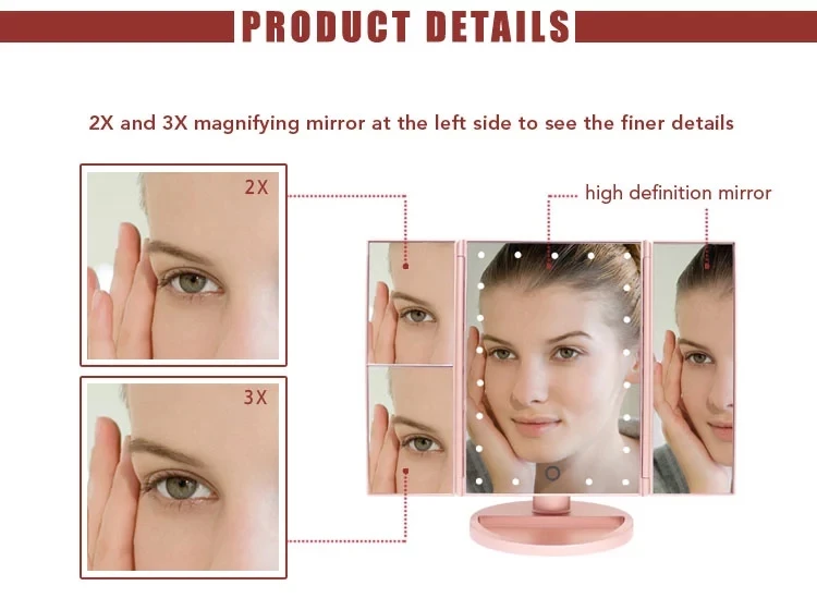 1. 3 Панель косметическое зеркало2. С увеличительным зеркалом 10x3. Светодиодные лампы 24 шт.4. Трехслойный дизайн5. USB заряжаемый или 4 шт. AAA аккумулятор6. Стабильная подставка и вращение на 180 °7. Сенсорный экран может регулировать яркость