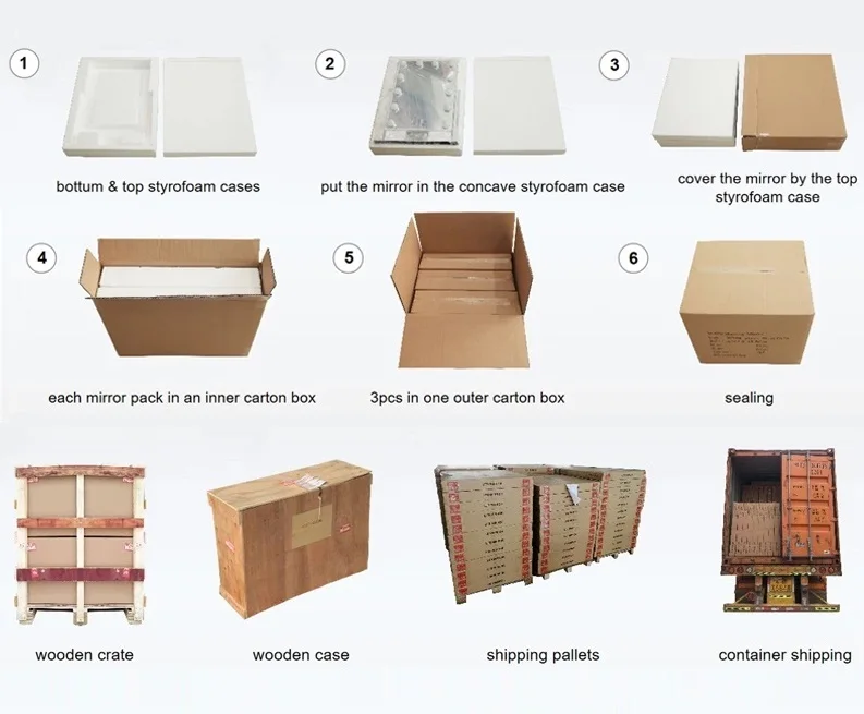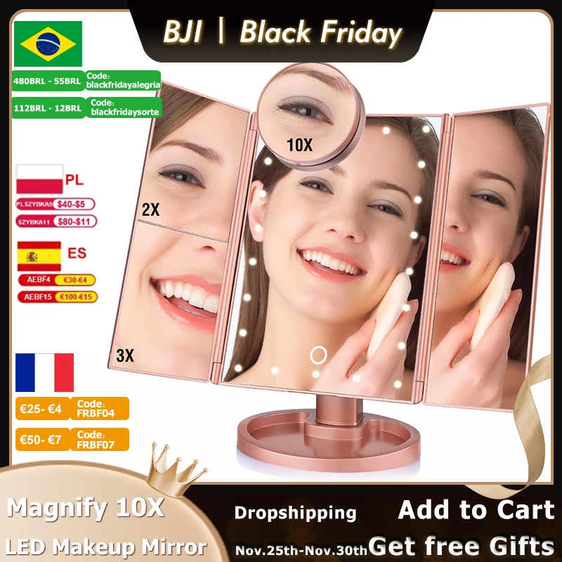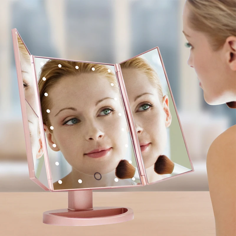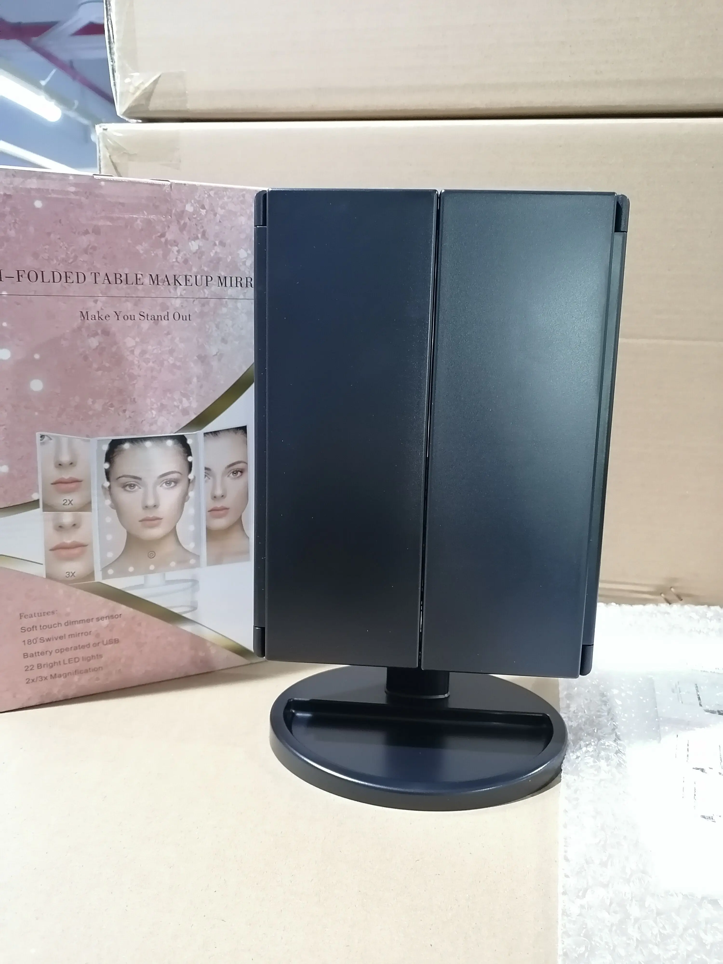 1. 3 Панель косметическое зеркало2. С увеличительным зеркалом 10x3. Светодиодные лампы 24 шт.4. Трехслойный дизайн5. USB заряжаемый или 4 шт. AAA аккумулятор6. Стабильная подставка и вращение на 180 °7. Сенсорный экран может регулировать яркость