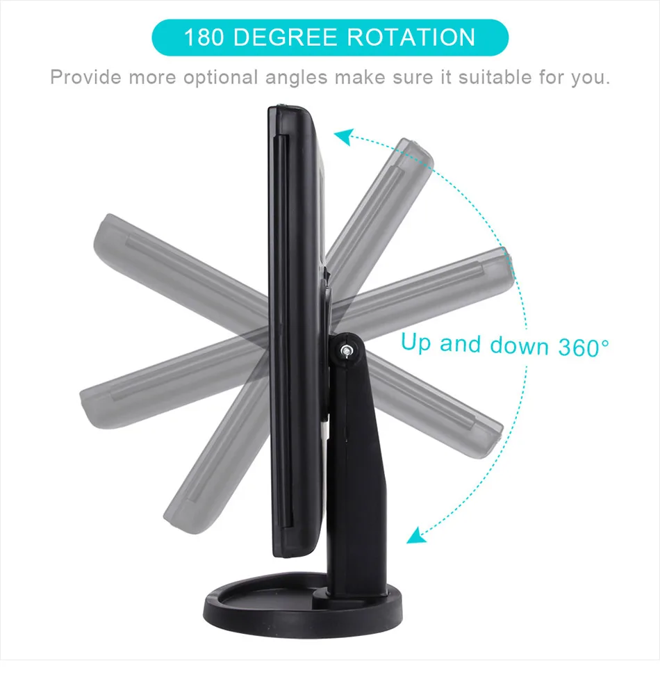1. 21 светодиодный светильник равномерно освещает, чтобы обеспечить идеальное зеркальное отображение в условиях тусклый светильник.2. Энергоэффективный Встроенный светодиодный светильник, сохраняет прохладу, сохраняя энергию.3. Двусторонняя мощность ed, 4 * AAA батареи (не входят в комплект) или управляется внешним портом Mirco USB, вы можете использовать внешний аккумулятор, настенное зарядное устройство USB, настольный ПК или ноутбук на светильник, резервный источник питания, когда батареи заканчиваются.4. Переключатель питания на задней панели, переверните к включению. Небольшой круг в центре нижней части зеркала, коснитесь круга, включите/выключите светильник.5, 1X, 2X 3X и 10X увеличение-получите близкий вид с зеркалом, которое увеличивает ваше изображение.6. Идеально подходит для нанесения подводки для глаз, макияжа глаз и других задач, требующих точности.7. Он имеет обычное зеркало на одном размере и увеличительные зеркала на другом, что делает это очень универсальный инструмент для вашей коллекции красоты.8. Регулируемая наклонная подставка, которая позволяет расположить ее под ваши предпочтения, и использовать зеркало, даже если вы стоите.9. Трехслойный дизайн позволит сэкономить много места на вашем столе.